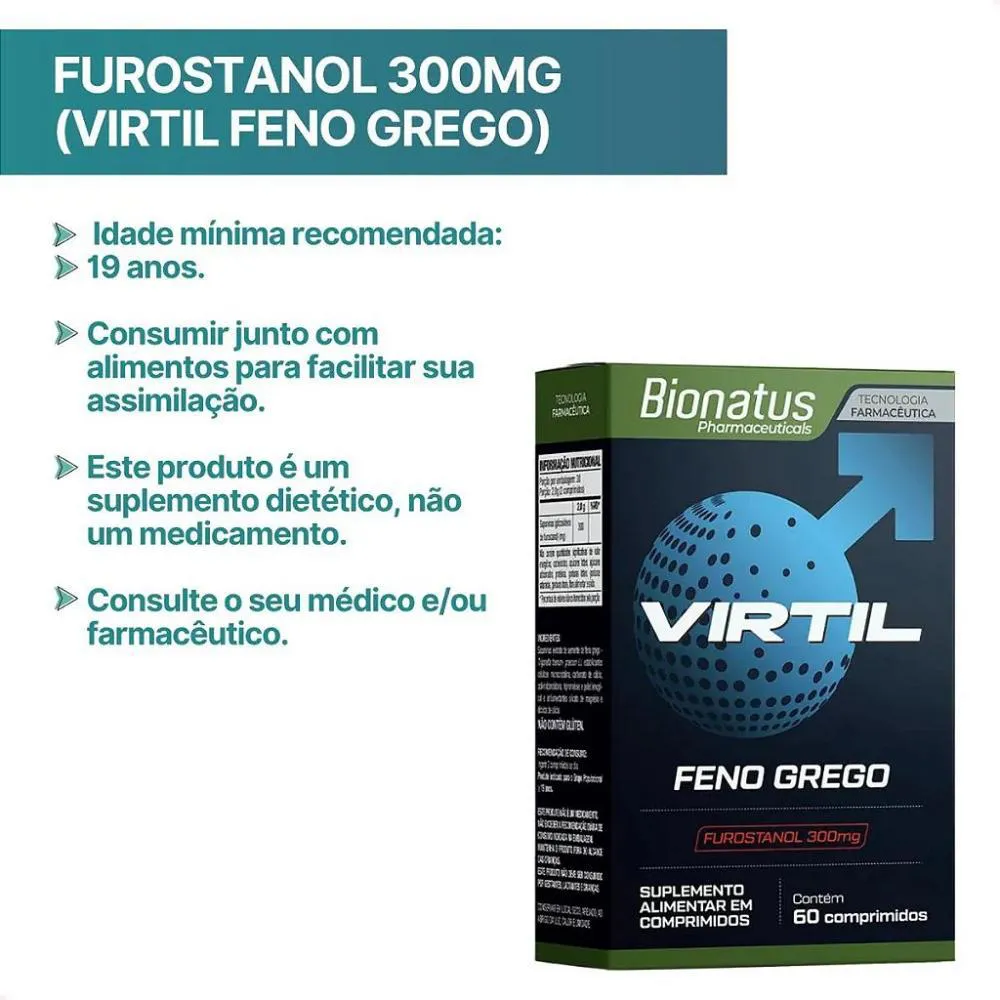 Virtil Feno Grego 300mg Bionatus 60 Comprimidos é um suplemento alimentar à base de extrato de feno-grego, tradicionalmente utilizado por suas propriedades benéficas à saúde. Benefícios: