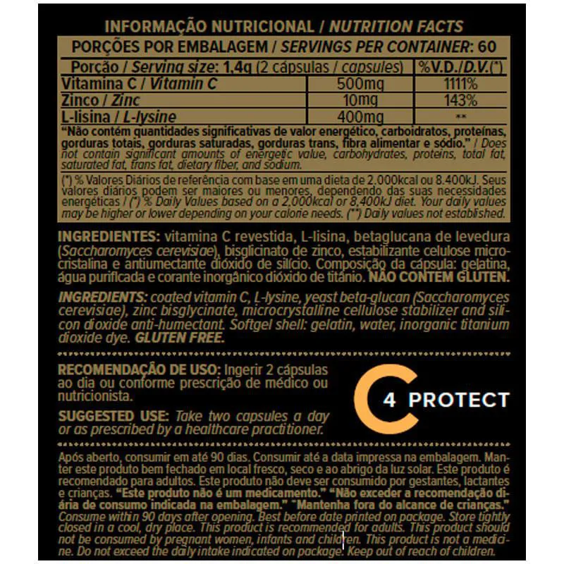 A Vit C 4 Protect Essential Nutrition 120 cápsulas é um suplemento alimentar que combina ingredientes importantes para cuidar de você e sua família. Cada cápsula fornece 500mg de vitamina C revestida (melhor absorção), 10 mg de zinco, beta glucana de levedura e aminoácido .