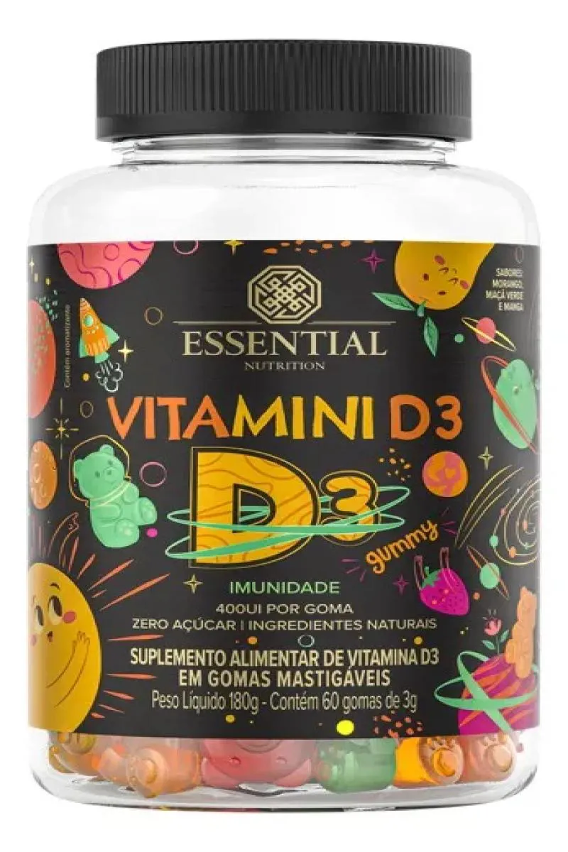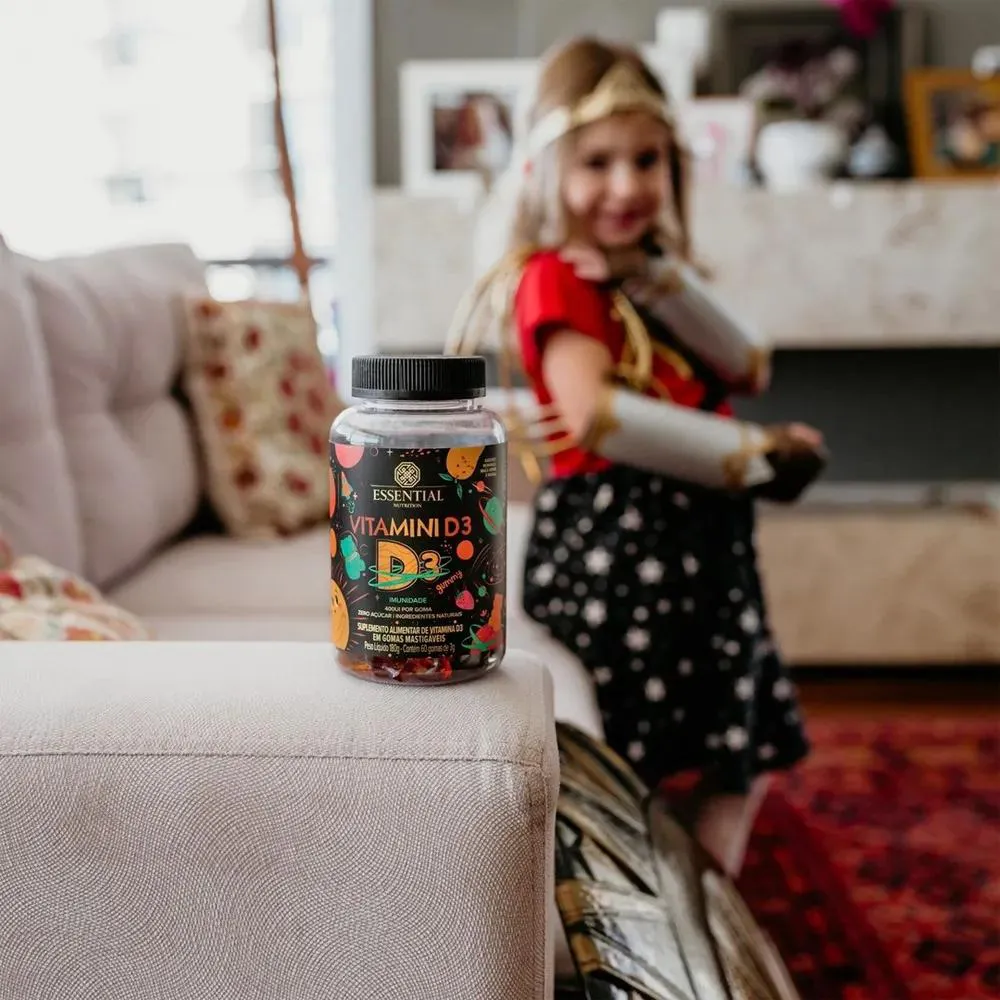 Gominhas, vitaminadas, saborosas e divertidas. A vitamina d está presente em todas as etapas do desenvolvimento infantil. E sabe onde podemos encontrá-la? Em uma alimentação equilibrada, através da luz do sol, que ativa a vitamina D no nosso corpo, e na VITAMINI D3 GUMMY, pensada especialmente para as crianças. Todas as propriedades da vitamina D3 em deliciosos sabores Nutrição infantil não é brincadeira. Mas agora pode ser divertida e saborosa, pois Vitamini D3 vem em 3 deliciosos sabores: morango, manga e maçã verde. E ainda: sem açúcar, sem substâncias artificiais, sem glúten e sem lactose. Nutrição em dia: o primeiro passo para os primeiros sonhos: A infância é uma fase de crescimento e desenvolvimento e um dos momentos mais importantes de nutrição. É essencial ter bons níveis de vitaminas para brincar, aprender e aproveitar a melhor fase da vida. A vitamina D auxilia: No funcionamento do sistema imune Na formação de ossos e dentes Na manutenção de níveis de cálcio no sangue Na absorção de cálcio e fósforo