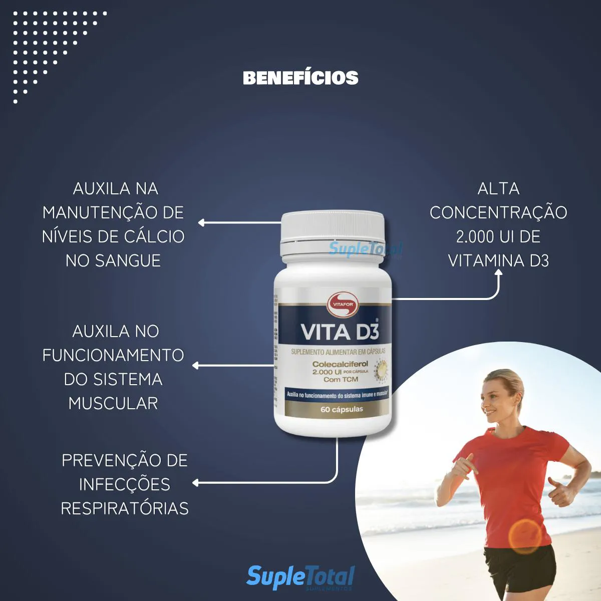 Além de funcionar de forma preventiva em várias doenças, estudos relatam benefícios da suplementação com vitamina D como a prevenção de infecções respiratórias e ganho de força muscular em atletas.