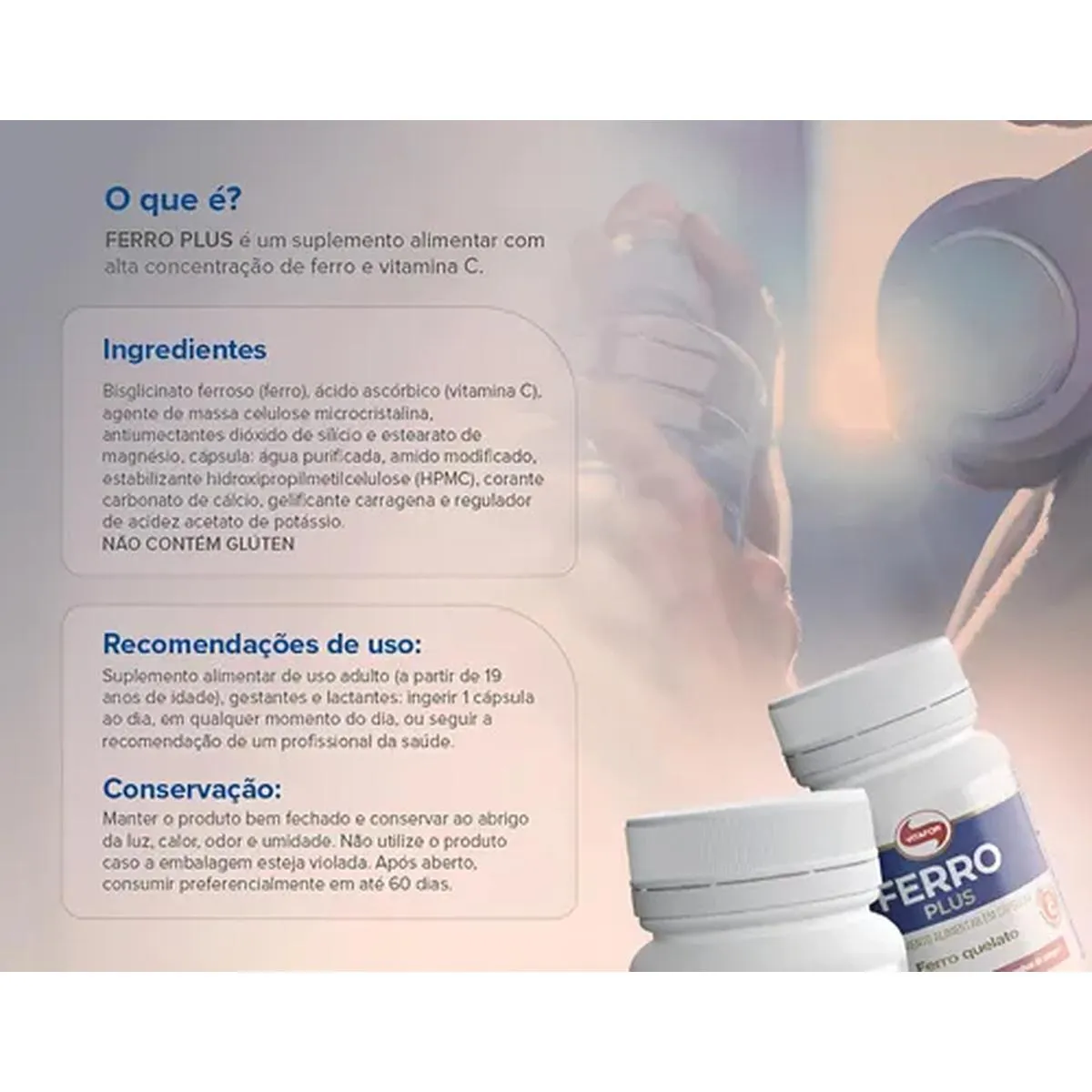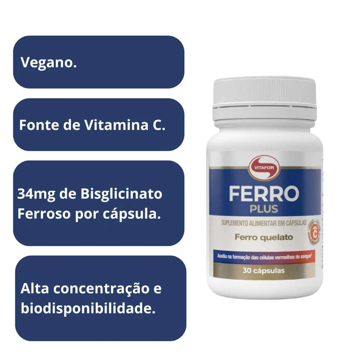 O Vitafor Ferro Plus é um suplemento alimentar formulado com ferro quelato de alta absorção, associado às vitaminas C, B6, B12 e ácido fólico. Auxilia na formação das células vermelhas do sangue e na redução do cansaço e da fadiga. Características:- Contém ferro quelato de alta biodisponibilidade