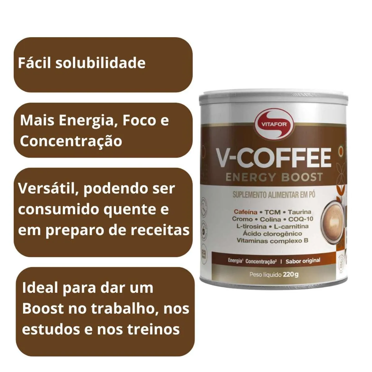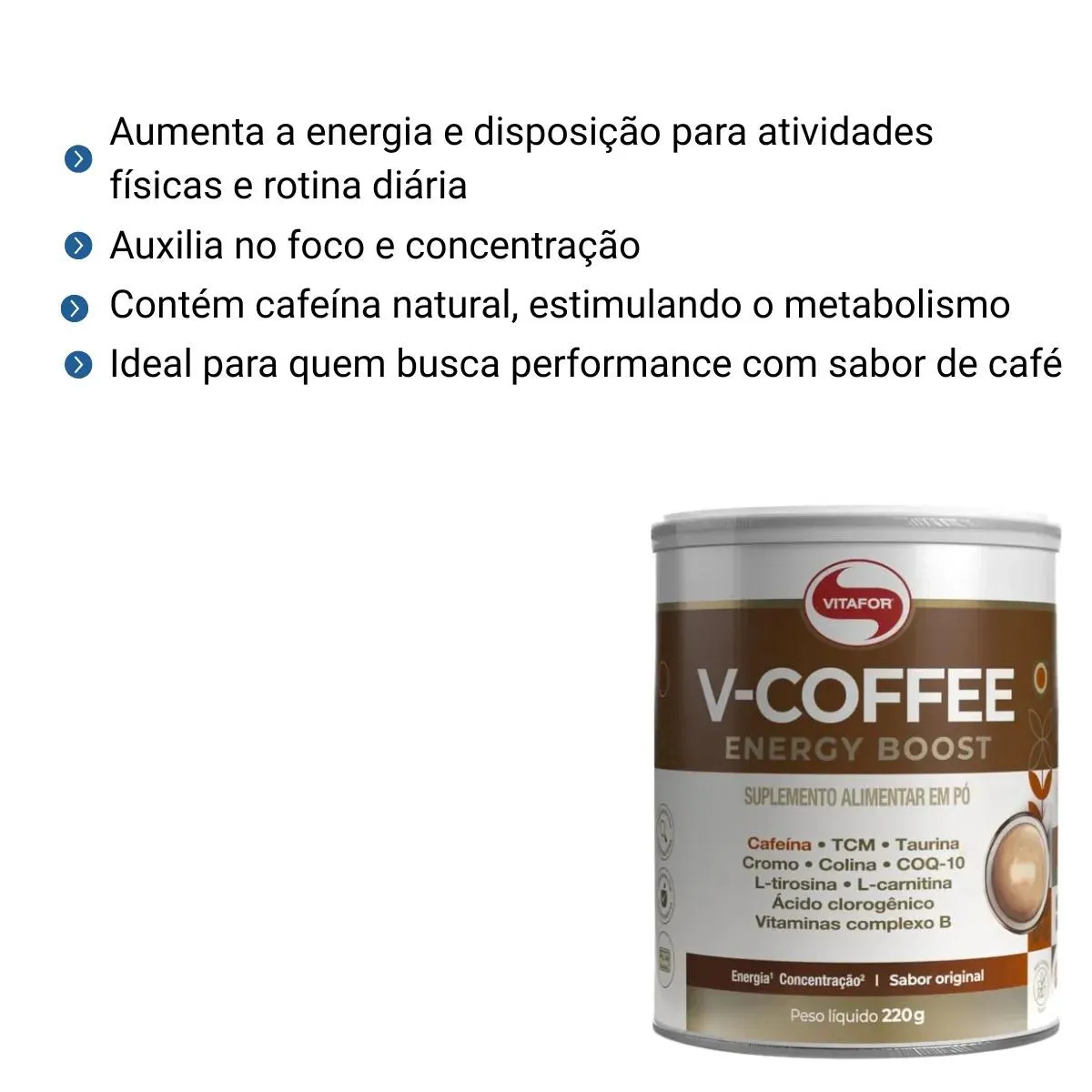 O Vitafor V-Coffee Energy Boost é um suplemento em pó que combina café com nutrientes energéticos e antioxidantes para melhorar o foco, a disposição e o desempenho físico e mental. Ideal para quem busca mais energia e concentração no dia a dia. Características:- Fórmula com café, taurina, cafeína e TCM (triglicerídeos de cadeia média)