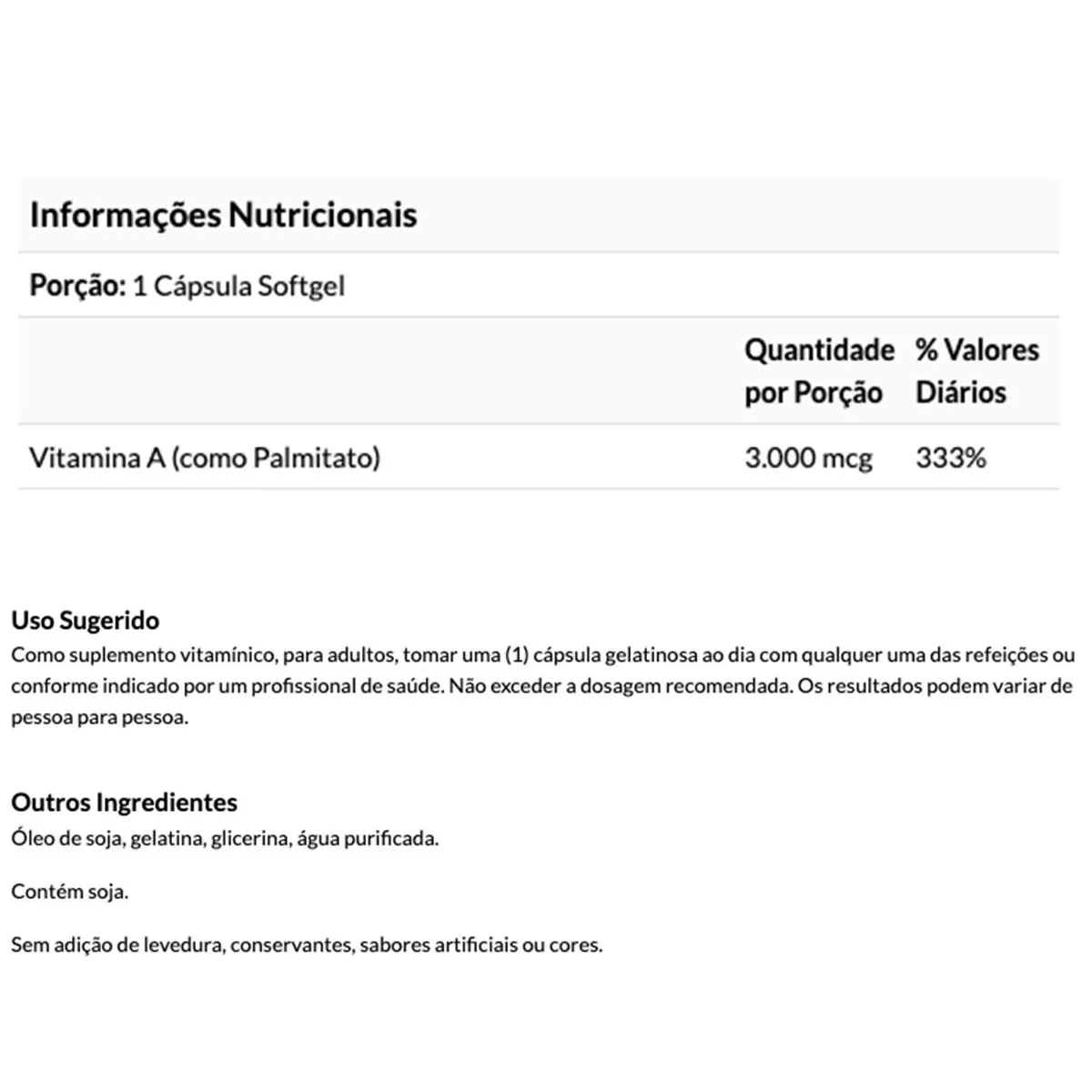 ATENÇÃO Produto original importado Produto disponível no Brasil A vitamina A é essencial para a manutenção dos tecidos que revestem as superfícies internas e externas do corpo, incluindo olhos, pele, vias respiratórias, gastrointestinais e urinárias. BENEFÍCIOS: v Nutriente essencial ao tecido humano v Essencial para a saúde ocular v Auxilia a função imunológica saudável SUGESTÃO DE USO: Tomar 1 cápsula ao dia com uma refeição.