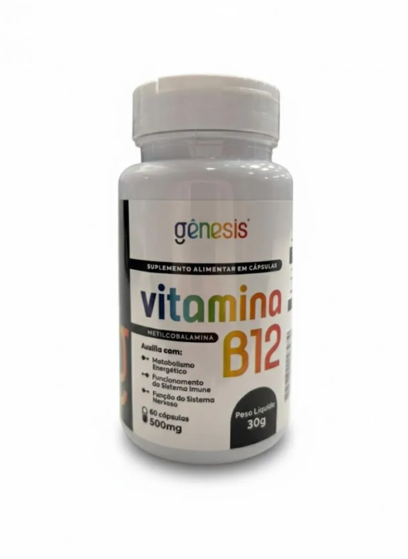 vitamina B12 (Metilcobalamina) Gênesis – 60 Cápsulas A Vitamina B12 da Gênesis é um suplemento alimentar de alta qualidade formulado com Metilcobalamina, a forma ativa e biodisponível da vitamina B12. Essencial para o bom funcionamento do corpo, este suplemento em cápsulas é ideal para quem busca mais energia e suporte para a saúde neurológica e imunológica. Cada porção de 2 cápsulas fornece 100% da Ingestão Diária Recomendada (IDR), garantindo que você atinja suas necessidades nutricionais com eficácia A Metilcobalamina é uma vitamina indispensável que auxilia em funções vitais do organismo: Metabolismo Energético: Atua no processo de liberação de energia, ajudando a combater o cansaço e a fadiga e contribuindo para a vitalidade diária. Função do Sistema Imune: Auxilia na formação e maturação das células do sistema imunológico, fortalecendo as defesas do corpo. Função do Sistema Nervoso: É crucial para a manutenção da bainha de mielina, que protege os nervos, ajudando na saúde e função adequada do sistema nervoso.