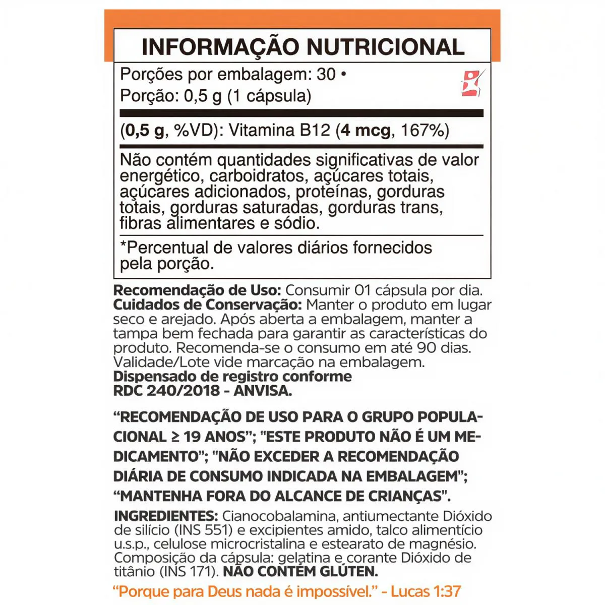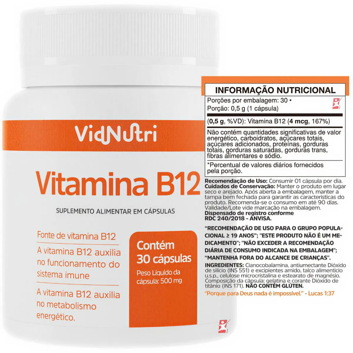 vitamina B12 CIANOCOBALAMINA 1 AO DIA 30 CAPSULAS - VIDNUTRI DESCRIÇÃO A vitamina B12 auxilia na formação de células vermelhas do sangue, funcionamento do sistema imune, metabolismo energético, metabolismo dos carboidratos, proteínas e gorduras, metabolismo da homocisteína e processo de divisão celular. SUGESTÃO DE USO Consumir 01 cápsula ao dia. TABELA NUTRICIONAL - COMPOSIÇÃO - RECOMENDAÇÕES & CUIDADOS Anexo nas imagens do anúncio. REGISTRO ANVISA Dispensado de registro conforme RDC 240/2018 Anvisa.