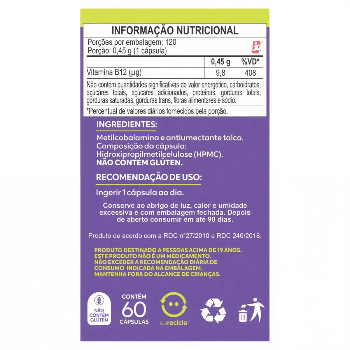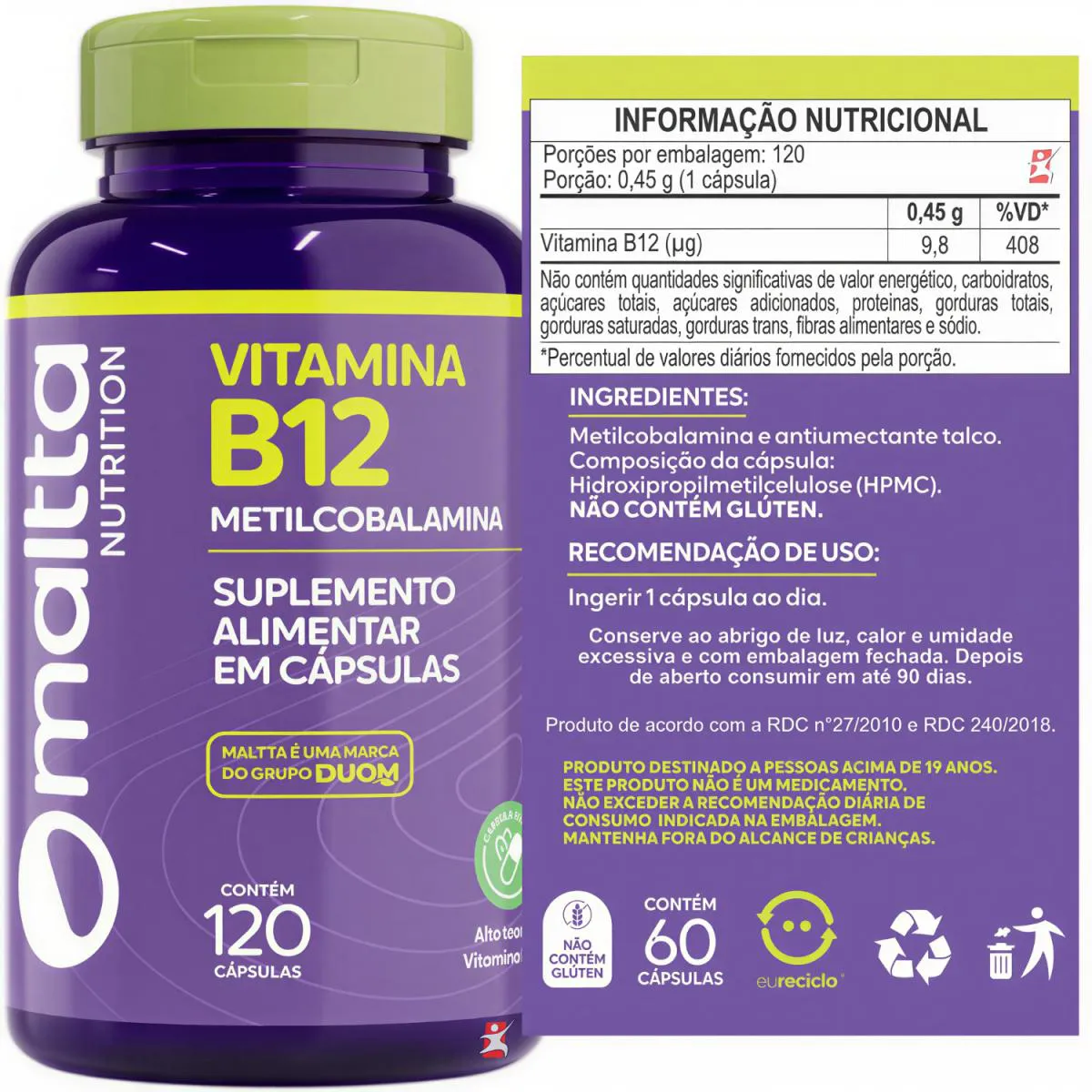 vitamina B12 METILCOBALAMINA CONCENTRADA 1 AO DIA 120 CÁPSULAS VEGETARIANAS - MALTTA NUTRITION DESCRIÇÃO A vitamina B12, também chamada de cianocobalamina ou cobalamina, é uma um grupo de componentes do complexo B que tem como principal componente o cobalto. A partir do momento em que é ingerida, a vitamina B12 participa do metabolismo de uma série de carboidratos e ácidos graxos, além da síntese de uma série de proteínas. Com isso, a vitamina B12 está presente na produção de energia das células, da manutenção e do reparo de componentes do sistema nervoso. Contribui para o desenvolvimento e a maturação das hemácias (os glóbulos vermelhos do sangue), responsável pelo transporte de oxigênio no organismo, bem como ajudando na formação dos neurônios. BENEFÍCIOS - Apenas 1 cápsula ao dia; - Cada frasco fornece 120 doses/porções – 4 meses; - 9,8mcg de Metilcobalamina por cápsula – 408% da IDR; - Auxilia no funcionamento do sistema imune e formação das células vermelhas; - Auxilia no processo de divisão celular; - Auxilia no metabolismo energético dos carboidratos, proteínas, gorduras e da homocisteína; - Auxilia na formação dos neurônios; - Cápsula vegetal; - Não contém Glúten, Açúcar e Lactose; - Sem corantes; - Não testado em animais; - Embalagem reciclável. SUGESTÃO DE USO Ingerir 1 cápsula ao dia. TABELA NUTRICIONAL – COMPOSIÇÃO & RECOMENDAÇÕES ANEXO NAS IMAGENS. DADOS TÉCNICOS Registro ANVISA – Produto de acordo com a RDC 27/2010 e RDC 240/2018. Marca – Duom: Maltta Nutrition. Conteúdo líquido total – 120 cápsulas. Rendimento líquido total – 120 doses/porções. Peso líquido total – 54g. Peso bruto total – 85g. Peso produto + embalagem (aproximado) – 200g. Código de barras (EAN) – 7898665752920. Dimensões do produto – largura 7cm; altura 11cm; comprimento 7cm. Dimensões da embalagem padrão – largura 13cm; altura 10cm; ; comprimento 16cm. ITENS DO ANÚNCIO 1 Unidade do produto: VITAMINA B12 METILCOBALAMINA CONCENTRADA 1 AO DIA 120 CÁPSULAS VEGETARIANAS - MALTTA NUTRITION. Total – 120 Cápsulas POR FRASCO.