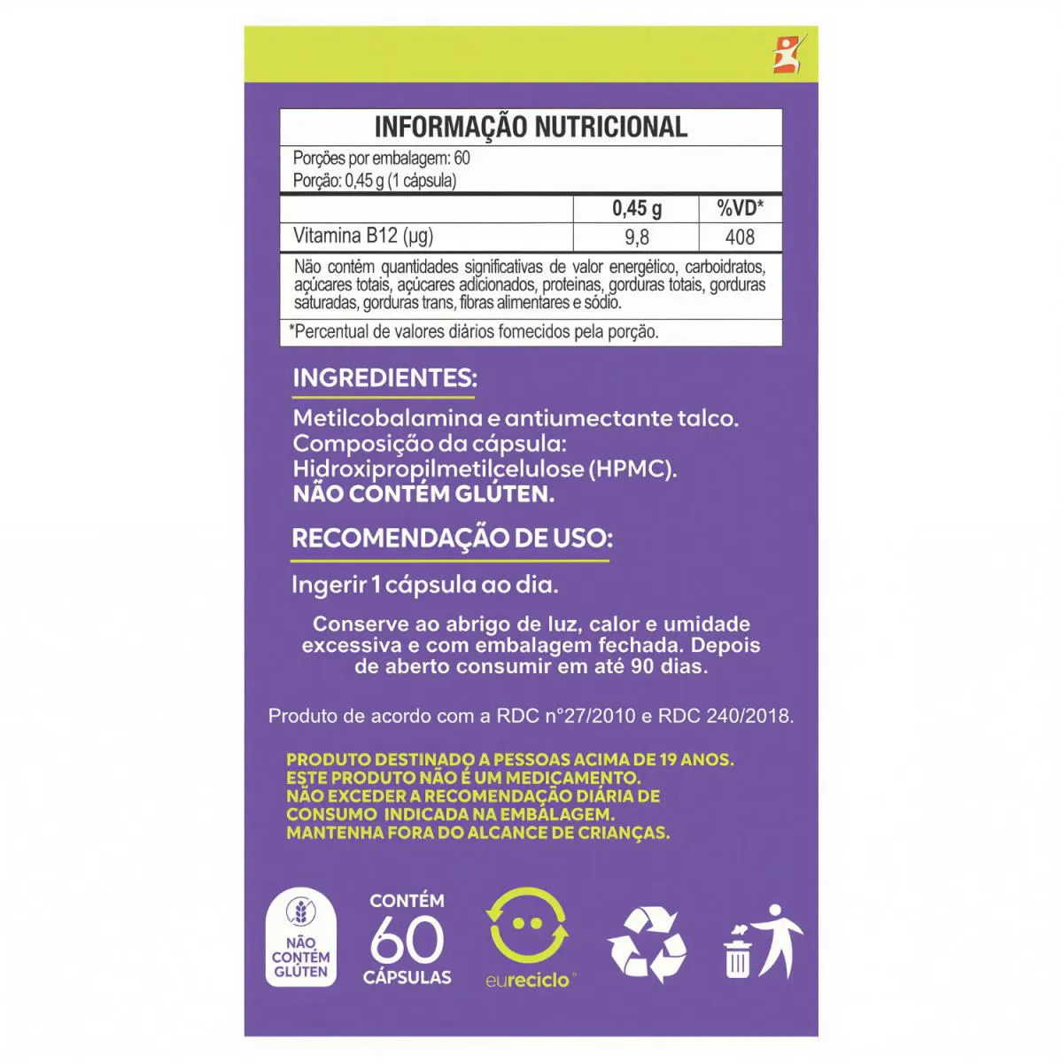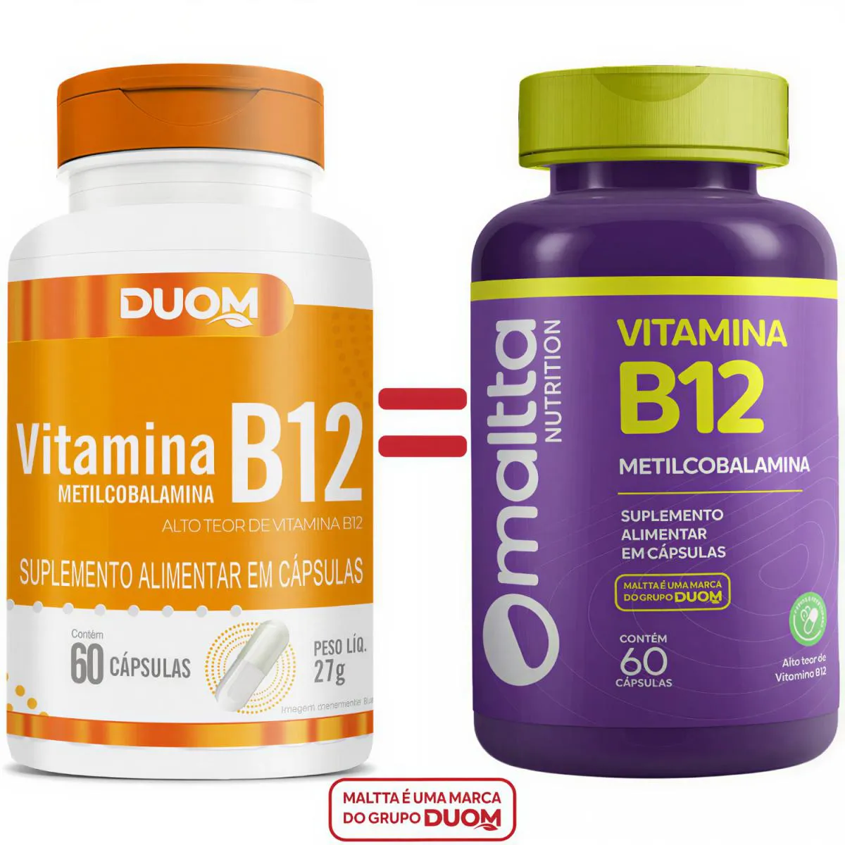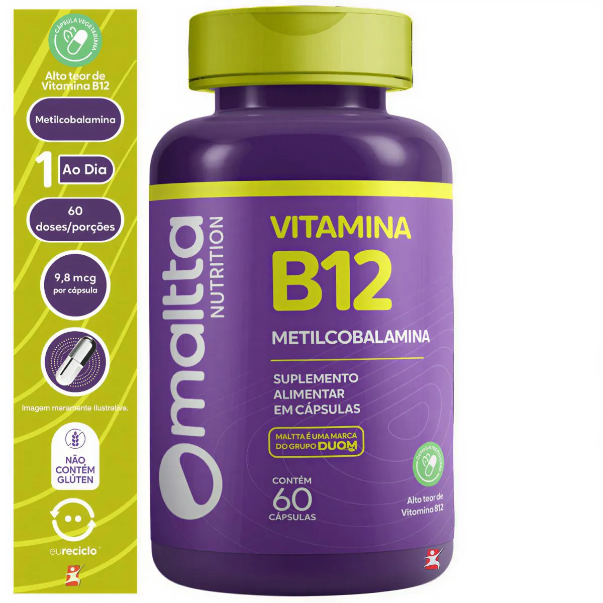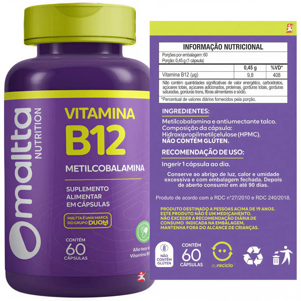 vitamina B12 METILCOBALAMINA ALTO TEOR 1 CÁPSULA AO DIA 60 CÁPSULAS VEGETARIANAS – MALTTA NUTRITION   DESCRIÇÃO A vitamina B12, também chamada de cianocobalamina ou cobalamina, é uma um grupo de componentes do complexo B que tem como principal componente o cobalto. A partir do momento em que é ingerida, a vitamina B12 participa do metabolismo de uma série de carboidratos e ácidos graxos, além da síntese de uma série de proteínas. Com isso, a vitamina B12 está presente na produção de energia das células, da manutenção e do reparo de componentes do sistema nervoso. Contribui para o desenvolvimento e a maturação das hemácias (os glóbulos vermelhos do sangue), responsável pelo transporte de oxigênio no organismo, bem como ajudando na formação dos neurônios.   BENEFÍCIOS - Apenas 1 cápsula ao dia; - Cada frasco fornece 60 doses/porções - 2 meses; - 9,8mcg de Metilcobalamina por cápsula - 408% da IDR; - Auxilia no funcionamento do sistema imune e formação das células vermelhas; - Auxilia no processo de divisão celular; - Auxilia no metabolismo energético dos carboidratos, proteínas, gorduras e da homocisteína; - Auxilia na formação dos neurônios; - Cápsula vegetal; - Não contém Glúten, Açúcar e Lactose; - Sem corantes; - Não testado em animais; - Embalagem reciclável.   SUGESTÃO DE USO Ingerir 1 cápsula ao dia.   TABELA NUTRICIONAL -COMPOSIÇÃO & RECOMENÇÕES ANEXO NAS IMAGENS.   DADOS TÉCNICOS Registro ANVISA – Produto de acordo com a RDC 27/2010 e RDC 240/2018. Marca – Duom: MALTTA NUTRITION. Conteúdo líquido total – 60 Cápsulas. Rendimento líquido total – 60 doses/porções. Peso líquido total – 27g. Peso bruto total – 50g.  Peso produto + embalagem (aproximado) – 150g. Código de barras (EAN) – 7898665751671. Dimensões do produto – altura 6,8 cm; largura 12 cm; comprimento 6,8 cm. Dimensões da embalagem padrão – altura 7 cm; largura 13 cm; comprimento 16cm.   ITENS DO ANÚNCIO 1 Unidade do produto: VITAMINA B12 METILCOBALAMINA ALTO TEOR 1 CÁPSULA AO DIA 60 CÁPSULAS VEGETARIANAS – MALTTA MALTTA NUTRITION. Total – 60 Cápsulas POR FRASCO.