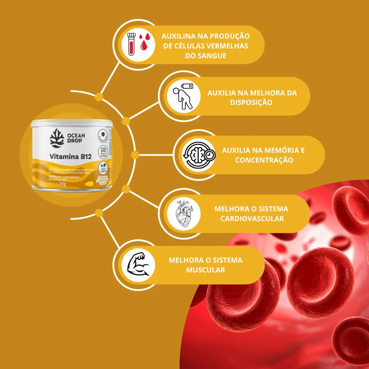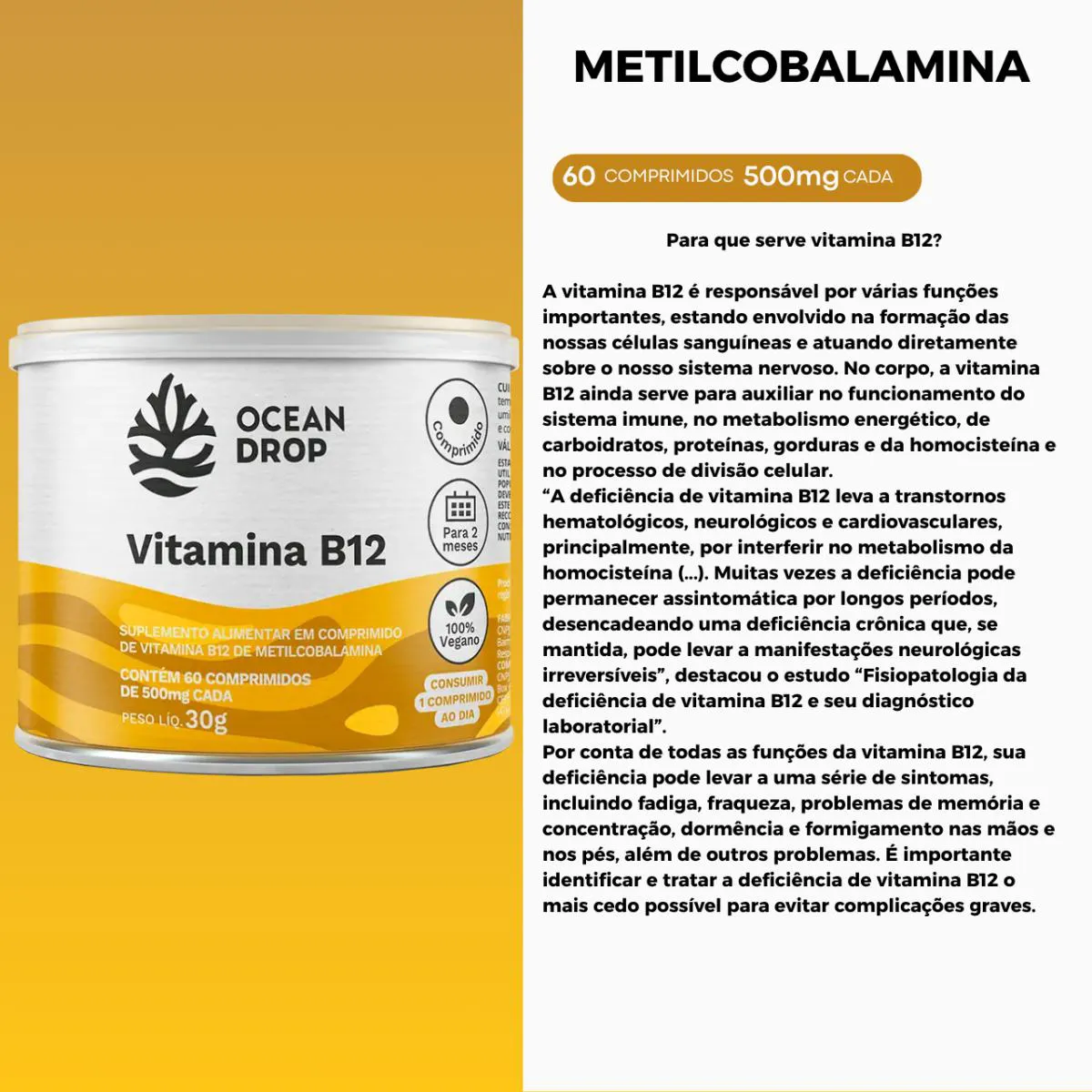 A vitamina B12 Metilcobalamina Ocean Drop é um suplemento nutricional completo, ideal para quem busca manter os níveis adequados de vitamina B12 no organismo com uma fonte 100% vegana, segura e de alta absorção. Cada comprimido contém 9,94mcg de metilcobalamina, a forma ativa da vitamina B12, reconhecida por sua biodisponibilidade superior e por não necessitar de conversão no fígado, garantindo absorção direta e eficiente pelo corpo. A B12 é uma das vitaminas essenciais para o bom funcionamento do organismo, especialmente no metabolismo energético, na formação de glóbulos vermelhos, no suporte ao sistema imunológico e na saúde do sistema nervoso. A deficiência dessa vitamina é comum, especialmente em pessoas que seguem uma dieta vegetariana ou vegana, idosos, gestantes e pessoas com baixa absorção intestinal. A Ocean Drop desenvolveu esse suplemento pensando justamente nessas necessidades, oferecendo uma opção prática, confiável e eficaz. A suplementação com metilcobalamina é amplamente recomendada por profissionais de saúde por se tratar da forma mais pura e ativa da B12, sendo especialmente indicada para quem precisa de um reforço na energia diária, foco mental, disposição e na manutenção de uma boa saúde neurológica. Cada frasco contém 60 comprimidos veganos, de fácil ingestão, proporcionando dois meses de suplementação com a ingestão diária de apenas um comprimido. O produto é isento de glúten, lactose, corantes artificiais e ingredientes de origem animal. A vitamina B12 vegana da Ocean Drop é fabricada com ingredientes de alta qualidade e é ideal para quem busca um estilo de vida saudável, sustentável e com foco no bem-estar. Seja para prevenção de deficiência, suporte cognitivo ou mais energia no dia a dia, esse suplemento é uma excelente escolha. Além disso, o suplemento é livre de conservantes e aditivos químicos prejudiciais, sendo também uma escolha consciente para quem busca um produto ético, com rastreabilidade e compromisso com o meio ambiente. O uso diário da vitamina B12 pode auxiliar na prevenção de sintomas como cansaço extremo, falta de memória, anemia, formigamentos nas extremidades e mudanças de humor, que são frequentemente associados à carência dessa vitamina essencial. Recomenda-se o consumo de um comprimido ao dia ou conforme orientação de um profissional da saúde. Produto seguro, natural e eficaz para complementar sua rotina com mais saúde e equilíbrio.