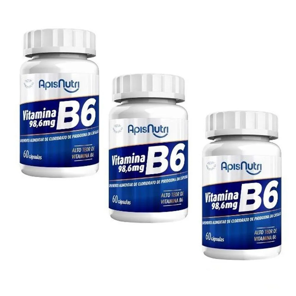 VITAMINA B6 280mg (60 caps) - APISNUTRI A vitamina B6, também conhecida como piridoxina, compõe o complexo B. Ela é necessária para o funcionamento adequado de mais de sessenta enzimas e essencial para a síntese normal do ácido nucléico e das proteínas. Participa da multiplicação de todas as células e da produção das hemácias e das células do sistema imunológico. Influencia o sistema nervoso através de seus efeitos sobre vários minerais e neurotransmissores cerebrais. A principal função metabólica da vitamina B6 é como coenzima. Tem um papel importante no metabolismo das proteínas, hidratos de carbono e lipídios. As suas principais funções são: a produção de epinefrina, serotonina e outros neurotransmissores, a formação do ácido nicotínico da vitamina, a decomposição do glicogénio e o metabolismo dos aminoácidos. Além disso, a vitamina B6 faz a quebra do glicogênio, ajuda na formação da hemoglobina, anticorpos e certos hormônios. Promove o bom funcionamento do sistema nervoso e imunológico e proporciona melhoras para a pele, músculo e sangue. BENEFÍCIOS * Melhora a saúde cardiovascular e cerebral;* Auxilia na produção de hormônios e neurotransmissores;* Auxilia na perda de peso e ganho de massa muscular. Embalagem disponível: frasco contendo 60 cápsulas.