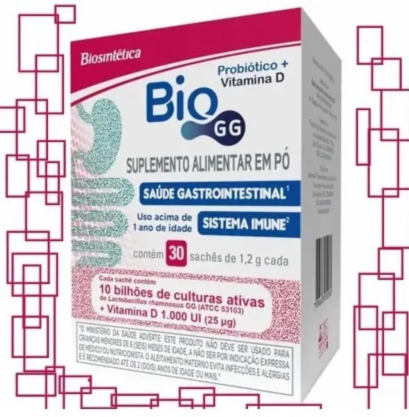 Bio GG Suplemento Alimentar 30 Saches - Biosintética É um produto que combina o probiótico Lactobacillus rhamnosus GG com vitamina D3 para auxiliar na saúde intestinal e no sistema imunológico. Ele é indicado para o equilíbrio da flora intestinal, para o reforço da imunidade, e pode ser usado em casos de diarreia ou constipação, sendo apresentado em pó para solução oral e podendo ser consumido por adultos e crianças conforme orientação médica. Saúde intestinal: A cepa probiótica Lactobacillus rhamnosus GG ajuda a manter o equilíbrio da microbiota intestinal, auxiliando na digestão e absorção de nutrientes. Sistema imunológico: A vitamina D3 presente na fórmula contribui para o bom funcionamento do sistema imune, além de auxiliar na saúde óssea. Ação combinada: A combinação de probiótico com vitamina d oferece benefícios para a saúde gastrointestinal e imunológica. Imagens Meramente Ilustrativas. Todas as Informações Divulgadas são de Responsabilidade Exclusiva do Fabricante/fornecedor.