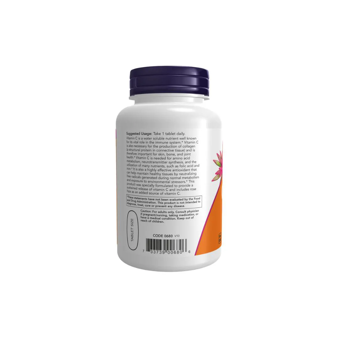 colágeno (uma proteína estrutural no tecido conjuntivo) e, portanto, é importante para a saúde da pele, dos ossos e das articulações.* A vitamina C é necessária para o metabolismo de aminoácidos, síntese de neurotransmissores e utilização de muitos nutrientes, como ácido fólico e ferro.* Também é um antioxidante altamente eficaz que pode ajudar a manter tecidos saudáveis, neutralizando os radicais livres gerados durante o metabolismo normal e a exposição a estressores ambientais.* Este produto foi especialmente formulado para fornecer uma liberação sustentada de vitamina C e inclui frutos de rosa mosqueta como fonte adicional de vitamina C. Pode ocorrer variação natural da cor deste produto.