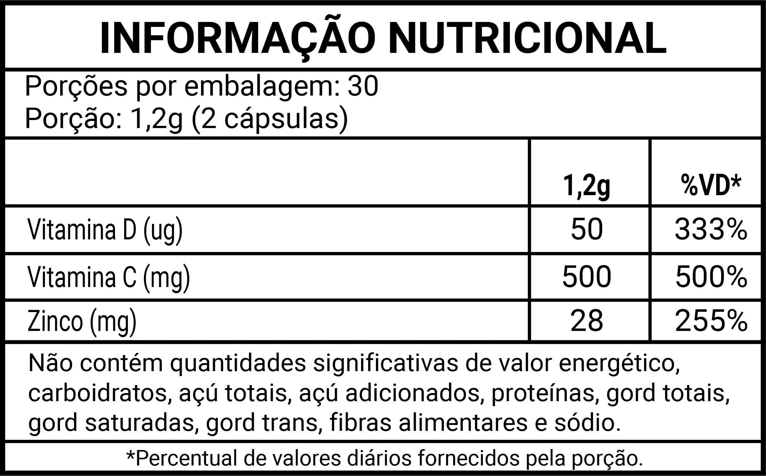 Ácido Ascórbico (Vitamina C), Bisglicinato de Zinco, Colecalciferol (Vitamina D3), Silicato de Magnésio (INS 553i), Dióxido de Silício (INS 551).