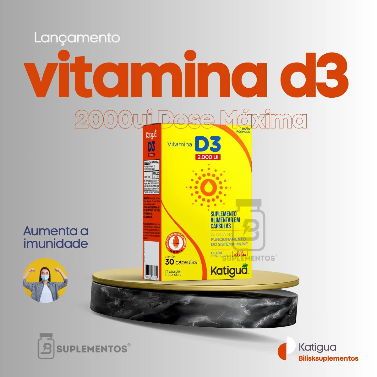 Suplemento alimentar em cápsulas com vitamina D3, nutriente essencial para a absorção de cálcio e manutenção da saúde dos ossos e dentes.Benefícios: