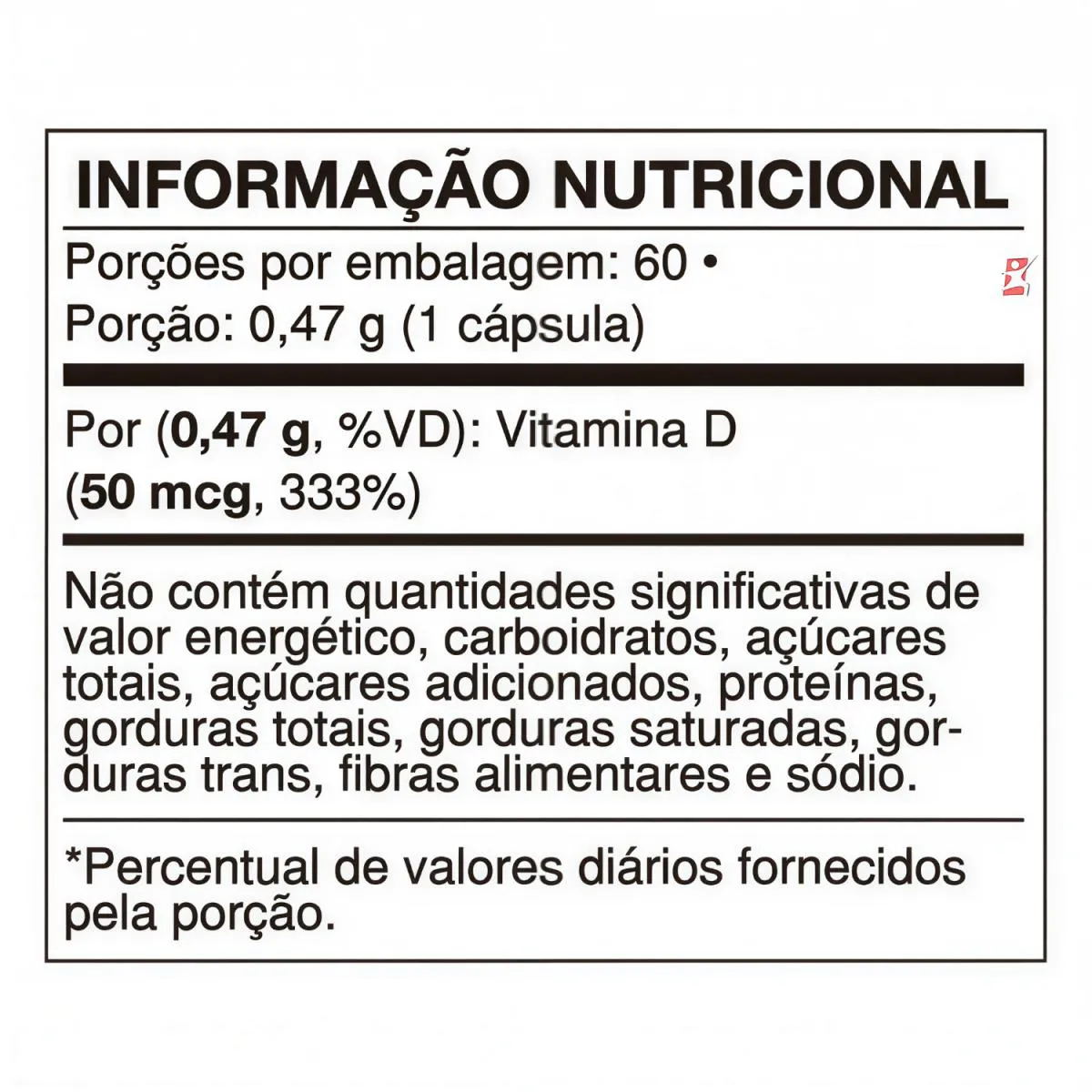 DESCRIÇÃO vitamina D - auxilia na formação de ossos e dentes, absorção de cálcio e fósforo, funcionamento do sistema imune, funcionamento muscular, manutenção de níveis de cálcio no sangue e processo de divisão celular. O que vem neste produto? Suplemento alimentar de vitamina d 2000UI em cápsulas. Quantas cápsulas tem nessa embalagem? Essa embalagem contém 60 cápsulas. Recomendações de Uso: Consumir 1 capsula por dia, uso para o grupo populacional ≥ 19 anos INGREDIENTES: Colecalciferol (vitamina D3), amido de milho modificado, antiumectante Dióxido de silício (INS 551). Precauções: Manter fora do alcance de crianças. TABELA NUTRICIONAL Anexo nas imagens do anúncio. RECOMENDAÇÕES, CUIDADOS & CONSERVAÇÃO “RECOMENDAÇÃO DE USO PARA O GRUPO POPULACIONAL ≥ 19 ANOS”; “ESTE PRODUTO NÃO É UM MEDICAMENTO”; “NÃO EXCEDER A RECOMENDAÇÃO DIÁRIA DE CONSUMO INDICADA NA EMBALAGEM”; “MANTENHA FORA DO ALCANCE DE CRIANÇAS.” “ESTE PRODUTO NÃO DEVE SER CONSUMIDO POR GESTANTES, LACTANTES E CRIANÇAS.” CONSERVAÇÃO: Manter o produto em lugar seco e arejado. Após aberta a embalagem, manter a tampa bem fechada para garantir as características do produto e recomenda-se o consumo em até 90 dias. REGISTRO ANVISA Dispensado de registro conforme RDC 240/2018 Anvisa.