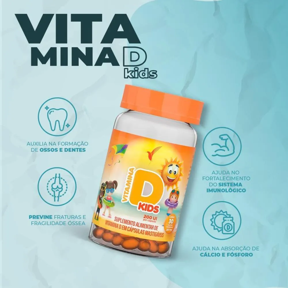 Modo de Uso: A vitamina D Kids é de uso diário. Ou seja, é necessário ingerir 1 cápsula ao dia. Seu consumo também deve ser acompanhado pela ingestão de líquidos no horário do dia que mais se adaptar a sua rotina.