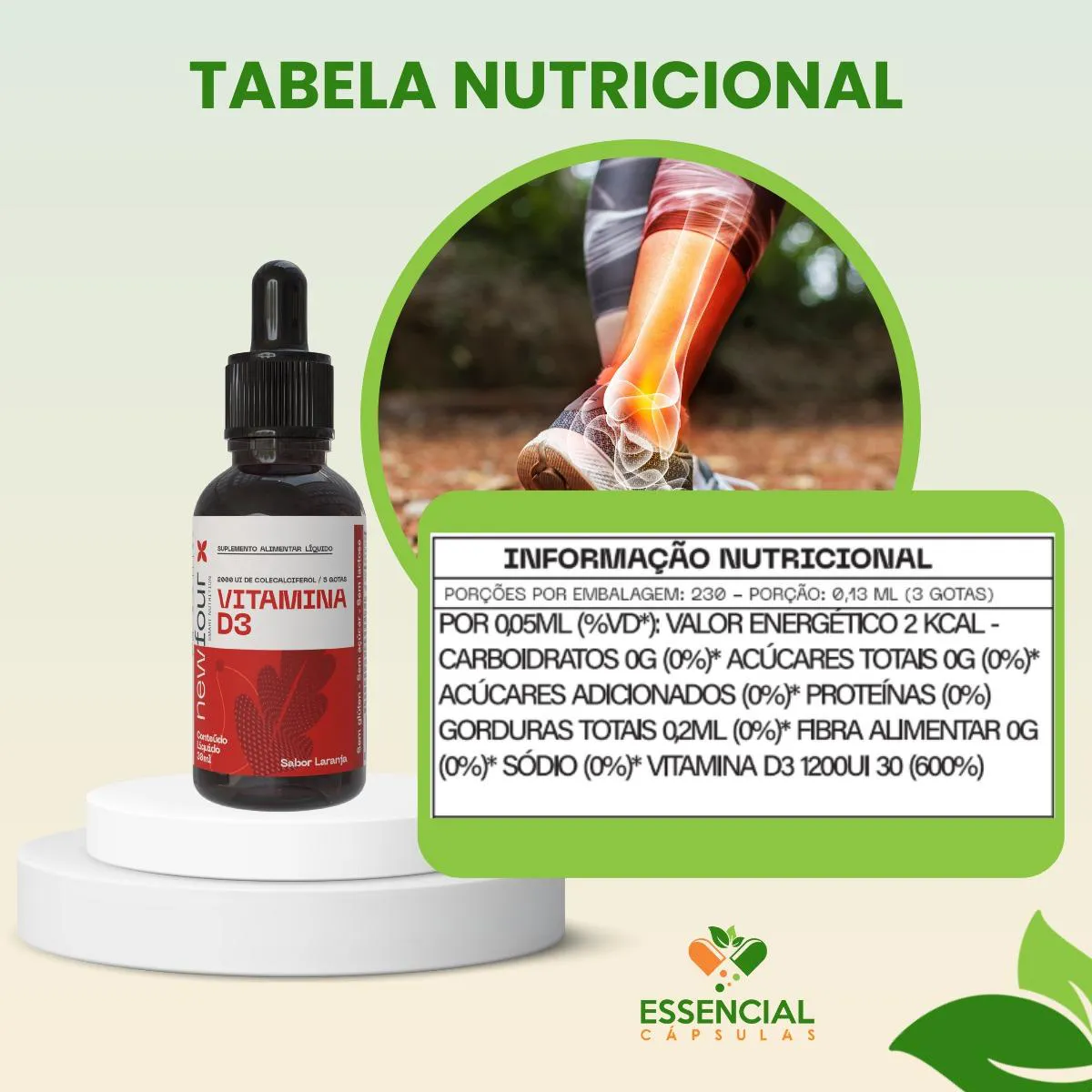 BEM VINDO(A) À ESSENCIAL CÁPSULAS Aqui, acreditamos que cuidar da saúde pode (e deve) ser algo natural, leve e diário. PRODUTO: - vitamina D3 em gotas MARCA: - NEW FOUR BENEFÍCIOS: ● Presente em rotinas voltadas à saúde óssea, muscular e imunológica. ● Vitamina essencial para manter o corpo em equilíbrio. SUGESTÃO DE CONSUMO (PELO FABRICANTE): - De 4 a 8 anos: 3 Gotas/dia - De 9 a 18 anos: 5 Gotas/dia - Acima de 19: 5 Gotas/dia IMPORTANTE SABER: - Este produto é um suplemento alimentar natural. - Não é medicamento e não substitui uma alimentação equilibrada nem o acompanhamento de um profissional da saúde. - Como um produto natural, seus benefícios podem ser vistos a partir de alguns dias do uso. - Os suplementos são destinados a pessoas saudáveis. Sua finalidade é fornecer nutrientes, substâncias bioativas, enzimas ou probióticos em complemento à alimentação. COMPOSIÇÃO: - ÓLEO DE algodão (GOSSYPIUM HERBACEUM), COLECALCIFEROL (VITAMINA D3), DLALFA-TOCOFEROL. NÃO CONTÉM GLÚTEN CONTRAINDICAÇÃO: - O uso não é recomendado para gestantes, lactantes e crianças. - Em caso de uso contínuo de medicamentos ou condições específicas de saúde, busque a orientação de um profissional da saúde. QUALIDADE: - Sabemos que o mercado de suplementos é competitivo, com opções para todos os públicos e faixas de preço. Na nossa loja, priorizamos a qualidade em cada detalhe. Por isso, escolhemos trabalhar apenas com fábricas que utilizam matérias-primas de excelência e seguem rigorosos padrões de produção. ENVIAMOS RAPIDINHO: - Seu pedido é preparado com todo cuidado e postado em até 24 horas úteis após a confirmação da compra. (Na maioria das vezes, enviamos bem antes disso)! FALE CONOSCO: Tem dúvidas ou quer conversar sobre o produto? Nosso atendimento é humanizado e está sempre pronto para te ouvir com muita atenção!