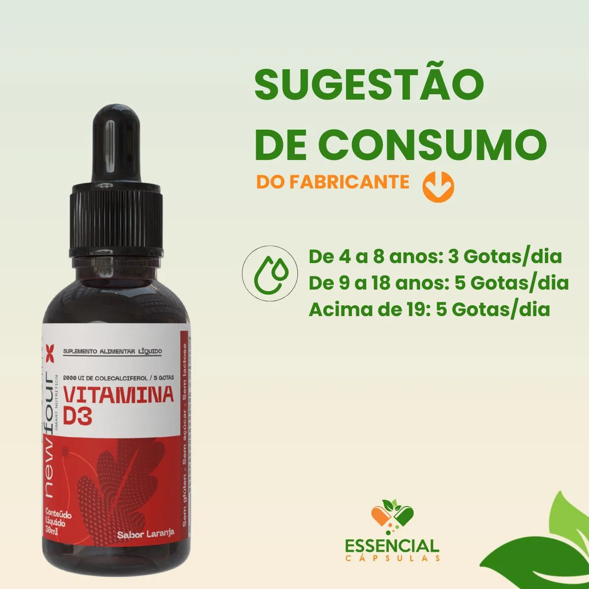BEM VINDO(A) À ESSENCIAL CÁPSULAS Aqui, acreditamos que cuidar da saúde pode (e deve) ser algo natural, leve e diário. PRODUTO: - vitamina D3 em gotas MARCA: - NEW FOUR BENEFÍCIOS: ● Presente em rotinas voltadas à saúde óssea, muscular e imunológica. ● Vitamina essencial para manter o corpo em equilíbrio. SUGESTÃO DE CONSUMO (PELO FABRICANTE): - De 4 a 8 anos: 3 Gotas/dia - De 9 a 18 anos: 5 Gotas/dia - Acima de 19: 5 Gotas/dia IMPORTANTE SABER: - Este produto é um suplemento alimentar natural. - Não é medicamento e não substitui uma alimentação equilibrada nem o acompanhamento de um profissional da saúde. - Como um produto natural, seus benefícios podem ser vistos a partir de alguns dias do uso. - Os suplementos são destinados a pessoas saudáveis. Sua finalidade é fornecer nutrientes, substâncias bioativas, enzimas ou probióticos em complemento à alimentação. COMPOSIÇÃO: - ÓLEO DE algodão (GOSSYPIUM HERBACEUM), COLECALCIFEROL (VITAMINA D3), DLALFA-TOCOFEROL. NÃO CONTÉM GLÚTEN CONTRAINDICAÇÃO: - O uso não é recomendado para gestantes, lactantes e crianças. - Em caso de uso contínuo de medicamentos ou condições específicas de saúde, busque a orientação de um profissional da saúde. QUALIDADE: - Sabemos que o mercado de suplementos é competitivo, com opções para todos os públicos e faixas de preço. Na nossa loja, priorizamos a qualidade em cada detalhe. Por isso, escolhemos trabalhar apenas com fábricas que utilizam matérias-primas de excelência e seguem rigorosos padrões de produção. ENVIAMOS RAPIDINHO: - Seu pedido é preparado com todo cuidado e postado em até 24 horas úteis após a confirmação da compra. (Na maioria das vezes, enviamos bem antes disso)! FALE CONOSCO: Tem dúvidas ou quer conversar sobre o produto? Nosso atendimento é humanizado e está sempre pronto para te ouvir com muita atenção!