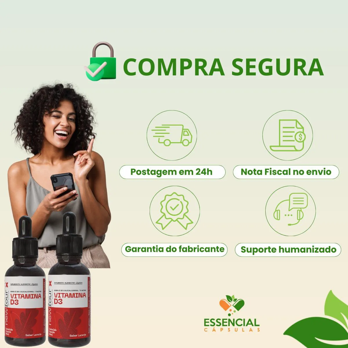 BEM VINDO(A) À ESSENCIAL CÁPSULAS Aqui, acreditamos que cuidar da saúde pode (e deve) ser algo natural, leve e diário. PRODUTO: - vitamina D3 em gotas MARCA: - NEW FOUR BENEFÍCIOS: ● Presente em rotinas voltadas à saúde óssea, muscular e imunológica. ● Vitamina essencial para manter o corpo em equilíbrio. SUGESTÃO DE CONSUMO (PELO FABRICANTE): - De 4 a 8 anos: 3 Gotas/dia - De 9 a 18 anos: 5 Gotas/dia - Acima de 19: 5 Gotas/dia IMPORTANTE SABER: - Este produto é um suplemento alimentar natural. - Não é medicamento e não substitui uma alimentação equilibrada nem o acompanhamento de um profissional da saúde. - Como um produto natural, seus benefícios podem ser vistos a partir de alguns dias do uso. - Os suplementos são destinados a pessoas saudáveis. Sua finalidade é fornecer nutrientes, substâncias bioativas, enzimas ou probióticos em complemento à alimentação. COMPOSIÇÃO: - ÓLEO DE algodão (GOSSYPIUM HERBACEUM), COLECALCIFEROL (VITAMINA D3), DLALFA-TOCOFEROL. NÃO CONTÉM GLÚTEN CONTRAINDICAÇÃO: - O uso não é recomendado para gestantes, lactantes e crianças. - Em caso de uso contínuo de medicamentos ou condições específicas de saúde, busque a orientação de um profissional da saúde. QUALIDADE: - Sabemos que o mercado de suplementos é competitivo, com opções para todos os públicos e faixas de preço. Na nossa loja, priorizamos a qualidade em cada detalhe. Por isso, escolhemos trabalhar apenas com fábricas que utilizam matérias-primas de excelência e seguem rigorosos padrões de produção. ENVIAMOS RAPIDINHO: - Seu pedido é preparado com todo cuidado e postado em até 24 horas úteis após a confirmação da compra. (Na maioria das vezes, enviamos bem antes disso)! FALE CONOSCO: Tem dúvidas ou quer conversar sobre o produto? Nosso atendimento é humanizado e está sempre pronto para te ouvir com muita atenção!