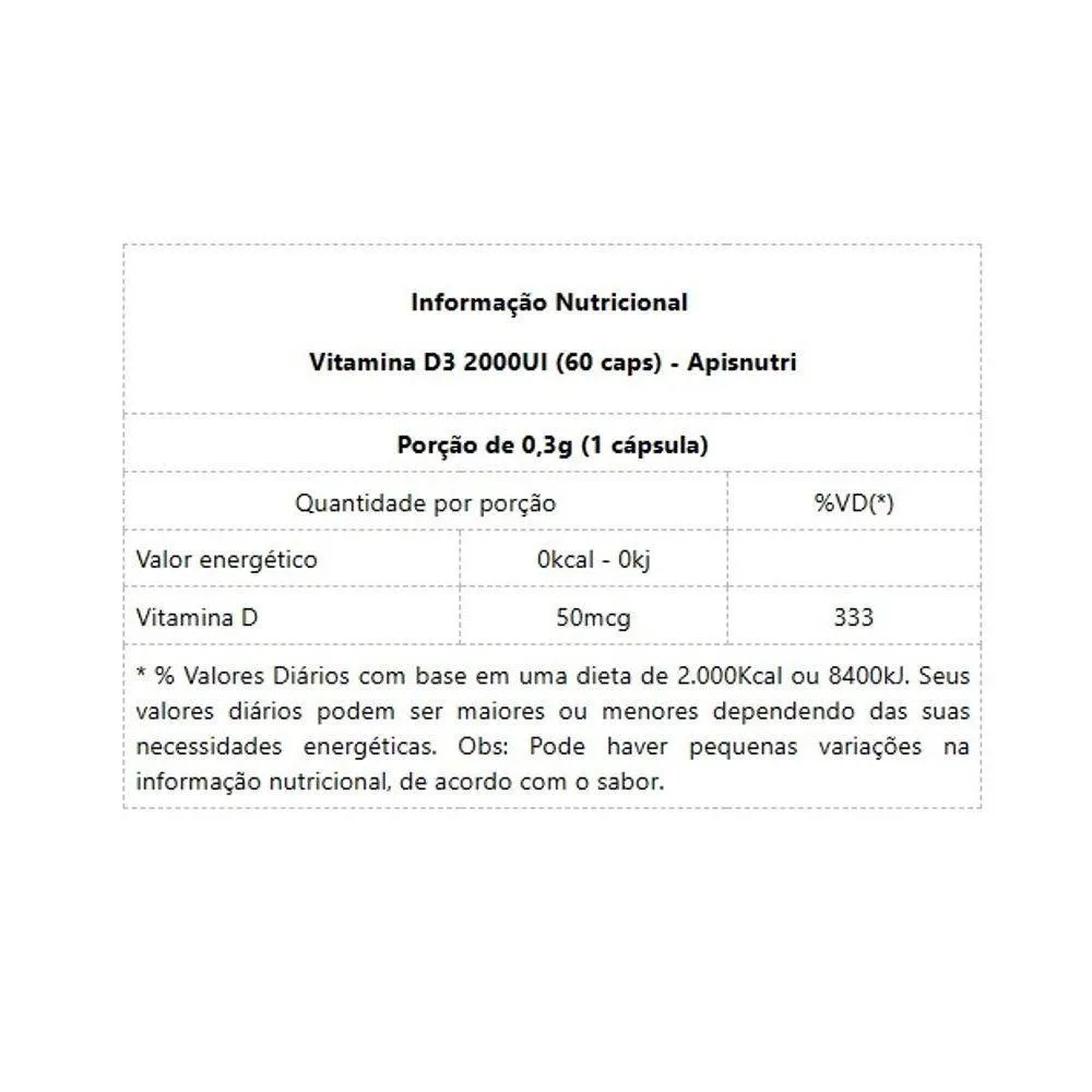 Informação Nutricional Vitamina D3 2000UI (60 caps) - ApisnutriPorção de 0,3g (1 cápsula)Quantidade por porção%VD(*)Valor energético0kcal - 0kj Vitamina D50mcg333* % Valores Diários com base em uma dieta de 2.000Kcal ou 8400kJ. Seus valores diários podem ser maiores ou menores dependendo das suas necessidades energéticas. Obs: Pode haver pequenas variações na informação nutricional, de acordo com o sabor.