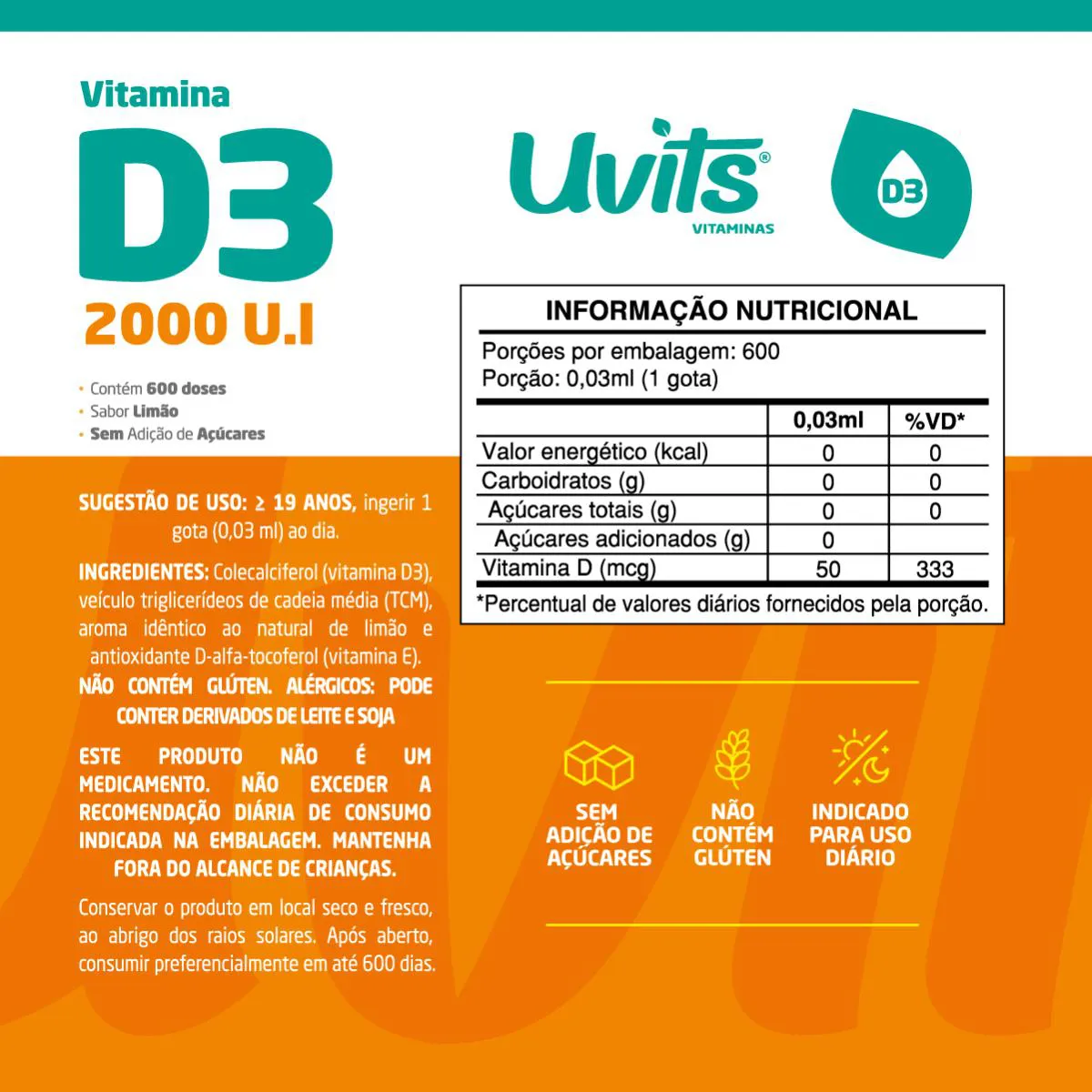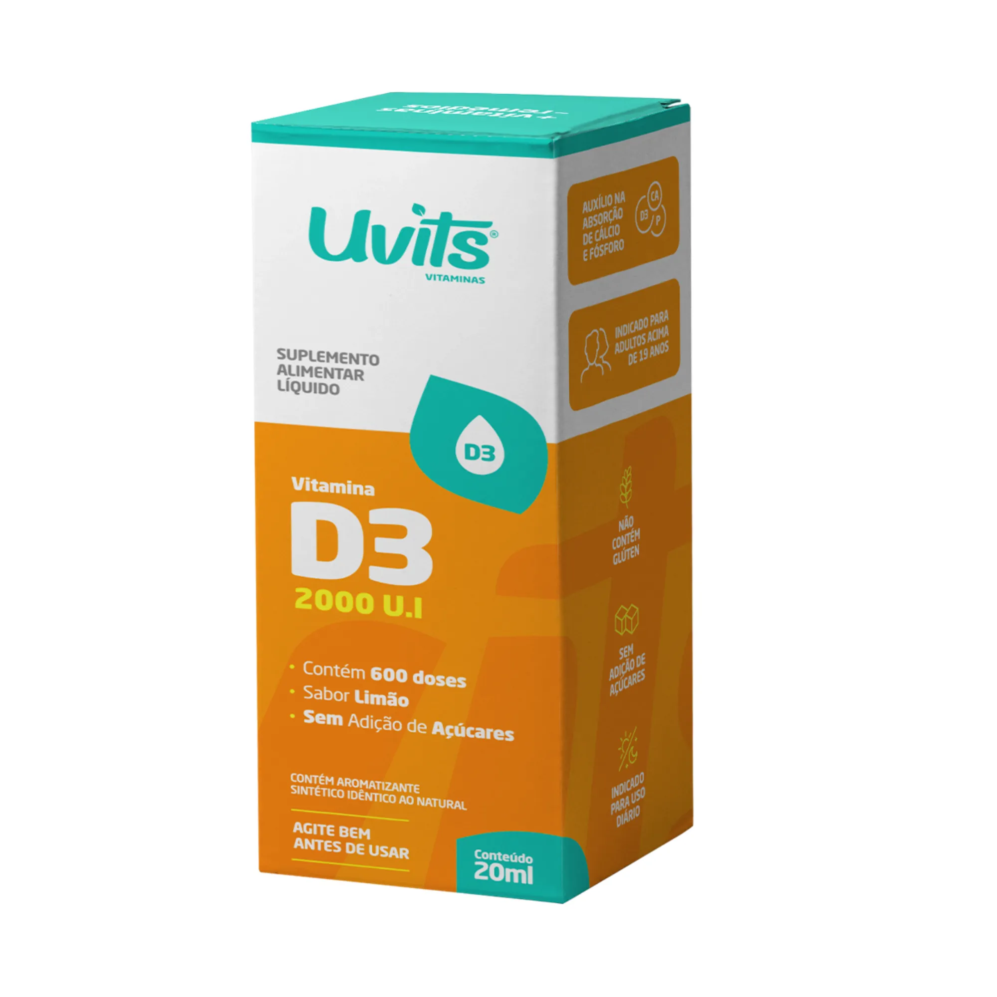 A vitamina D3 Uvits é um suplemento alimentar líquido desenvolvido para oferecer uma reposição prática e eficiente de Colecalciferol. Com uma fórmula de alta concentração, cada gota entrega 2000 UI (50 mcg) de vitamina D3, utilizando Triglicerídeos de Cadeia Média (TCM) como veículo para otimizar a estabilidade e a absorção do nutriente. É a escolha ideal para a rotina de adultos a partir de 19 anos, sendo um produto com fórmula limpa, Sem Adição de Açúcares e Não Contém Glúten.A vitamina d desempenha papéis fundamentais no organismo, e a apresentação em gotas da Uvits garante precisão e alto rendimento. Uma dose diária (1 gota) oferece: