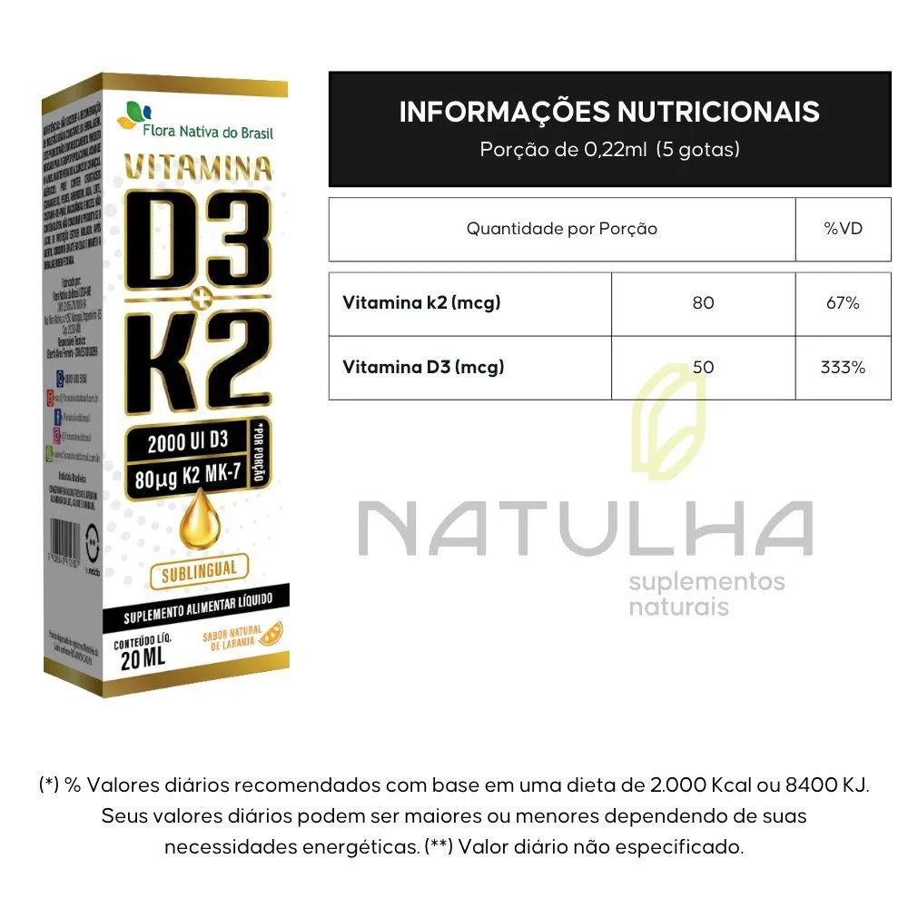 - Contém vitaminas D3 e K2 em gotas.