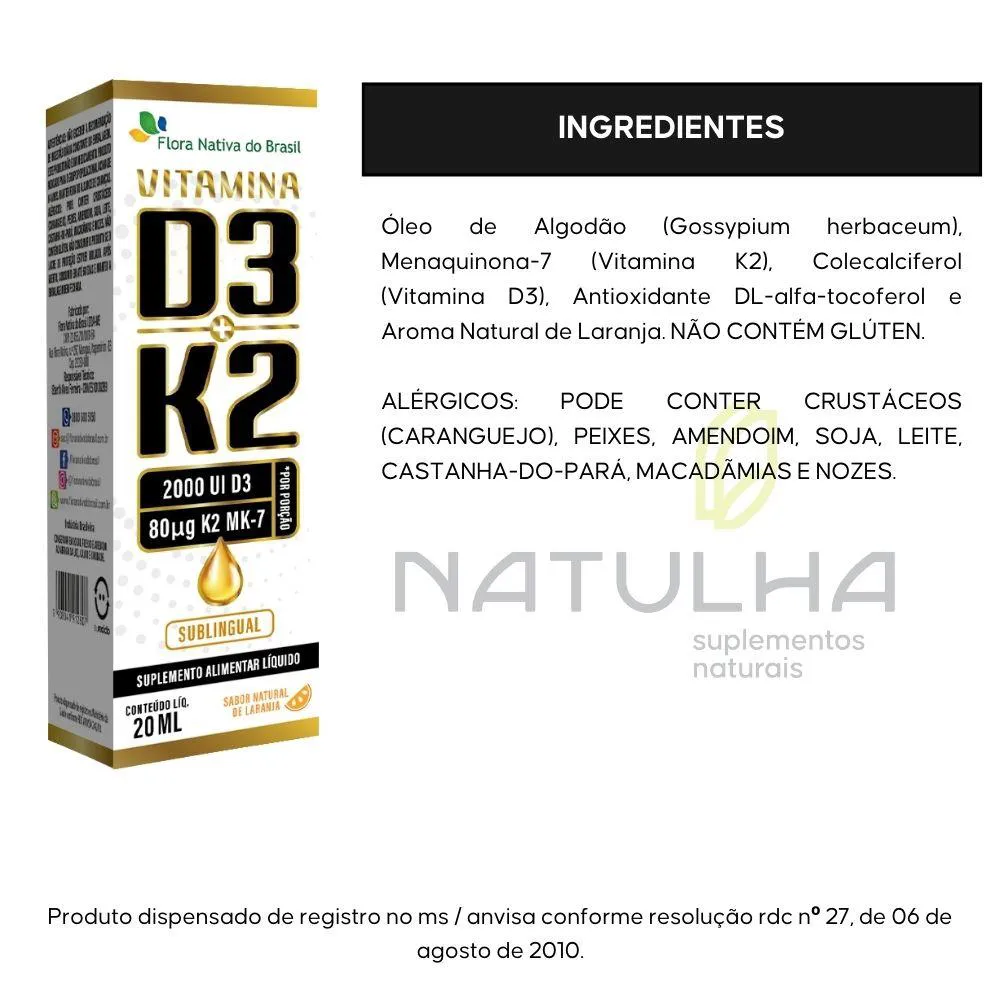 Óleo de algodão (Gossypium herbaceum), Menaquinona-7 (Vitamina K2), Colecalciferol (Vitamina D3), Antioxidante DL-alfa-tocoferol e Aroma Natural de Laranja. NÃO CONTÉM GLÚTEN.