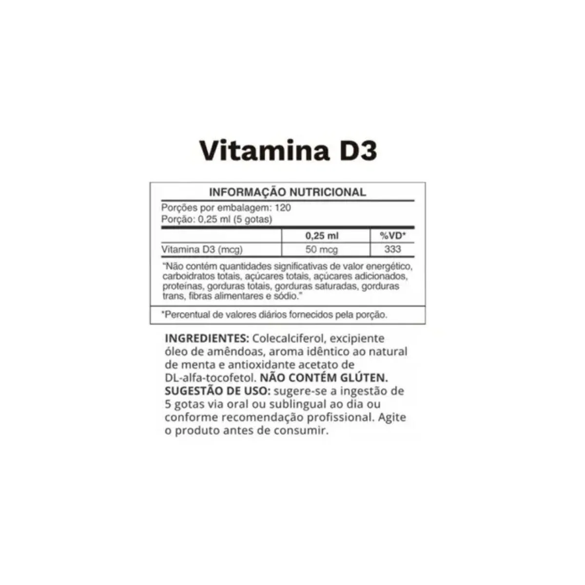 Concentração: 2.000 UI (50 mcg) de Vitamina D3 por porção (5 gotas) Conteúdo: 20 ml (aproximadamente 120 doses) Tipo: Suplemento de Vitamina D3 em Gotas Embalagem: Frasco com dosador de alta precisão Ingredientes: Vitamina D3 (Colecalciferol) em veículo oleoso. ATENÇÃO: Garanta o seu agora! Devido à sua dosagem eficiente de 2.000 UI e à sua alta absorção, nosso estoque limitado está acabando. Aproveite o preço especial para adquirir uma das últimas unidades disponíveis dessa fonte de vitaminas essenciais para o seu corpo. ESTE PRODUTO NÃO É UM MEDICAMENTO NÃO EXCEDA A DOSE RECOMENDADA MANTENHA LONGE DO ALCANCE DAS CRIANÇAS
