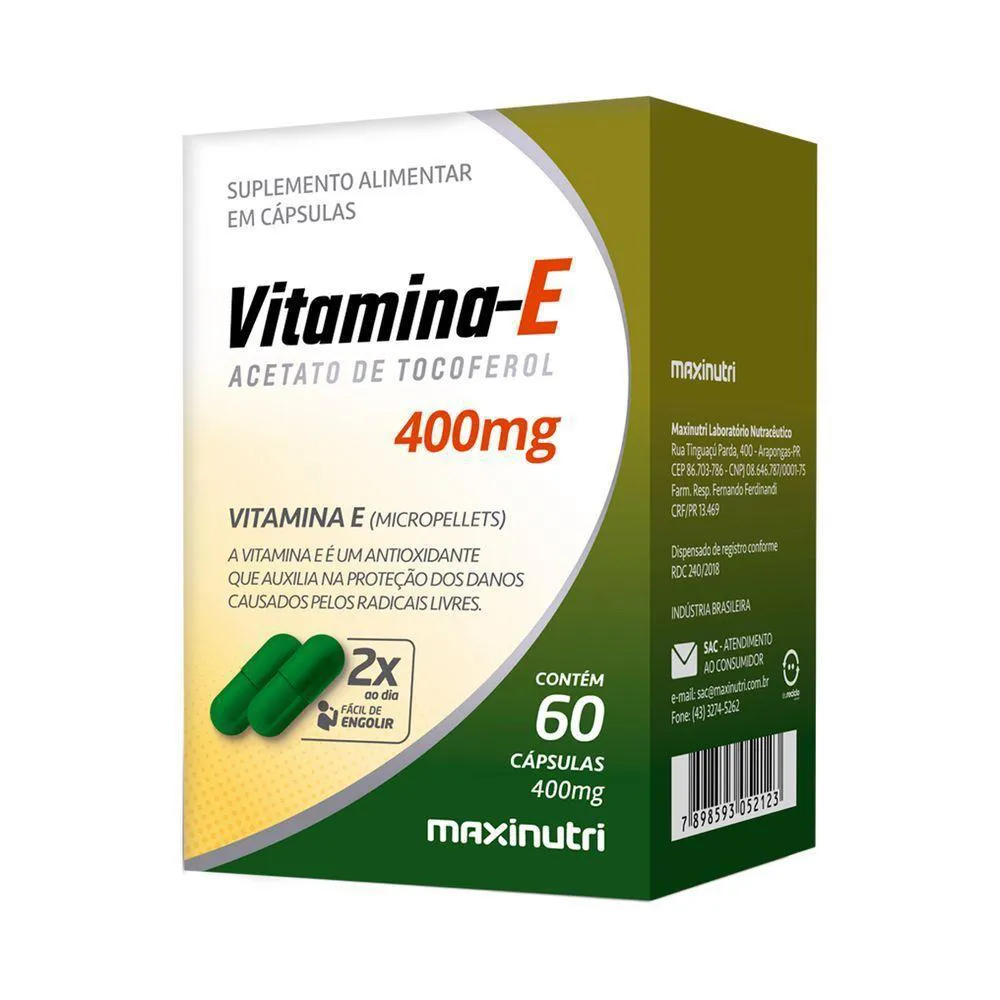 vitamina E 400mg Maxinutri 60 CápsulasDescubra a beleza natural da Vitamina E com nosso produto premium! Conhecida por suas propriedades antioxidantes, a Vitamina E é um poderoso aliado para cuidar da saúde da sua pele. Nossa fórmula exclusiva oferece nutrição profunda, ajudando a proteger contra os danos causados pelos radicais livres e promovendo uma aparência radiante e jovem. Experimente agora e eleve sua rotina de cuidados com a pele para o próximo nível, de forma natural e eficaz.A vitamina E é um nutriente essencial que desempenha um papel fundamental na saúde do corpo humano, atuando como um poderoso antioxidante. Ela é uma vitamina lipossolúvel, o que significa que se dissolve em gorduras e é armazenada no tecido adiposo do corpo.Modo de uso: Ingerir 2 cápsulas ao dia.Ingredientes: Vitamina E (micropellets de acetato de tocoferol) excipiente: silicato de magnésio, antiumectante: dióxido de silício, cápsula: gelatina e corantes: amarelo 10, amarelo 6, azorrubina, azul brilhante e dióxido de titânio.NÃO CONTÉM GLÚTEN.RDC: Dispensado de Registro