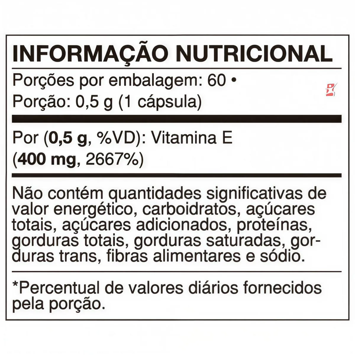 vitamina E - é um antioxidante que auxilia na proteção dos danos causados pelos radicais livres. Quantas cápsulas tem nessa embalagem? Essa embalagem contém 60 cápsulas. Recomendação de Uso: Consumir 02 cápsulas por dia. INGREDIENTES: Acetato de D-alfa-toceferol, Amido modificado, Antiumectante dióxido de silício (INS 551). Composição da cápsula: Gelatina, Umectante Glicerina (INS 422) e água purificada. NÃO CONTEM GLÚTEN. Precauções