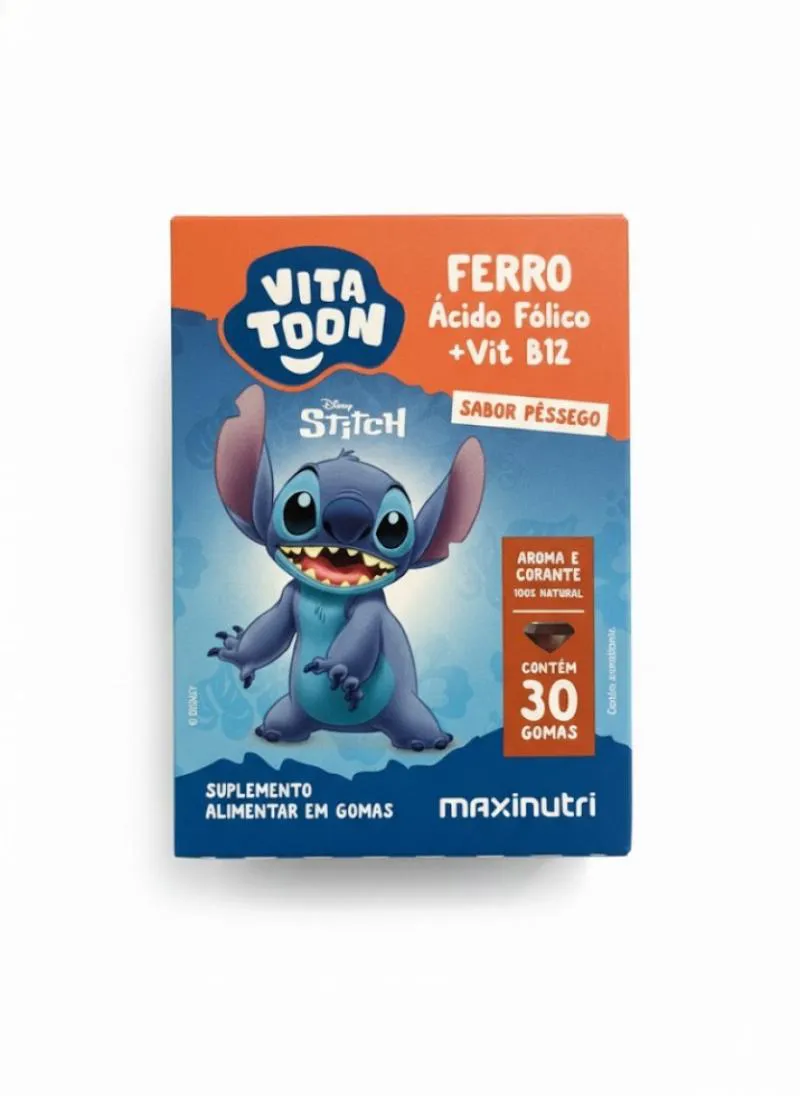 O Vitatoon Stitch Ferro + Ácido Fólico + vitamina B12 é um suplemento alimentar em gomas sabor pêssego, desenvolvido especialmente para complementar a alimentação de crianças e adultos a partir de 4 anos.Com aroma e corantes 100% naturais, ele traz diversão e nutrição no mesmo produto, com personagens Disney que tornam o momento de cuidar da saúde mais agradável. Cada goma fornece uma combinação essencial de Ferro, Ácido Fólico e Vitamina B12, nutrientes fundamentais para o metabolismo energético, a formação das células vermelhas do sangue e o bom funcionamento do sistema imune. O ferro e a vitamina B12 auxiliam no metabolismo energético, contribuindo para a disposição diária. O ferro, o ácido fólico e a vitamina B12 ajudam no funcionamento adequado do sistema imunológico. Esses nutrientes participam da formação das células vermelhas do sangue e do processo de divisão celular, importantes para o crescimento e renovação dos tecidos. O ferro é essencial para o transporte de oxigênio no organismo, auxiliando na oxigenação dos tecidos e no bom funcionamento dos músculos e órgãos.