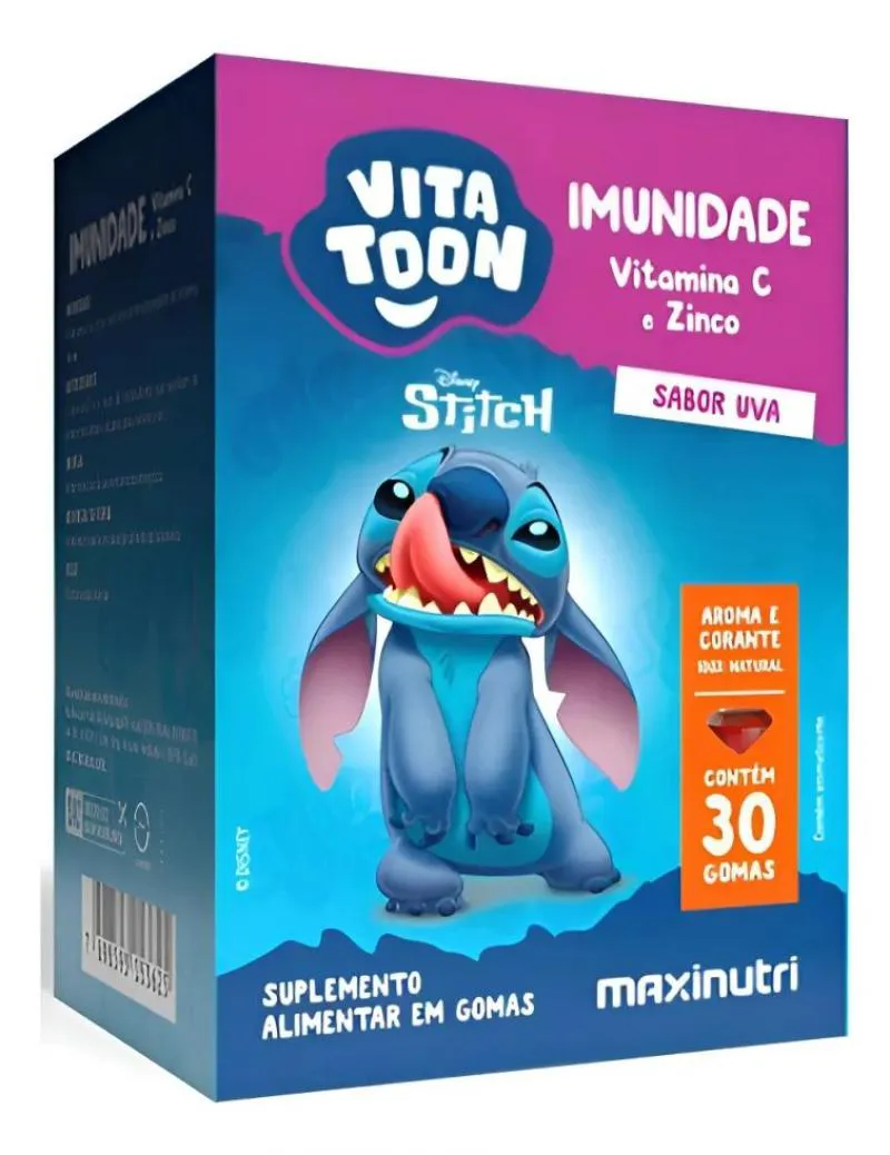 O Vita Toon Imunidade é o jeito mais fácil e gostoso de blindar a saúde do seu filho! Com a magia do personagem Stitch da Disney, este suplemento em gomas mastigáveis transforma a hora da vitamina em um momento de diversão.Informações e Benefícios Nutricionais: Principais Benefícios para o Seu Filho Com uma poderosa combinação de vitamina c e Zinco, o Vita Toon atua como um escudo protetor para o organismo: Vitamina C: É um nutriente essencial que atua diretamente no fortalecimento das defesas do corpo. Ela participa de diversas reações metabólicas e é crucial para a função de células do sistema imune. Zinco: Este mineral é vital para a regulação imunológica. Sua deficiência pode comprometer a função de células de defesa; a suplementação ajuda a garantir o suprimento necessário para um sistema imune robusto.Ação Antioxidante A Vitamina C é um potente antioxidante, o que significa que ela auxilia na proteção das células contra os danos causados pelos radicais livres. Contribuição para o Crescimento e Reparo O Zinco desempenha um papel importante na divisão celular e na síntese de proteínas, sendo fundamental para o processo de crescimento e desenvolvimento saudável das crianças.