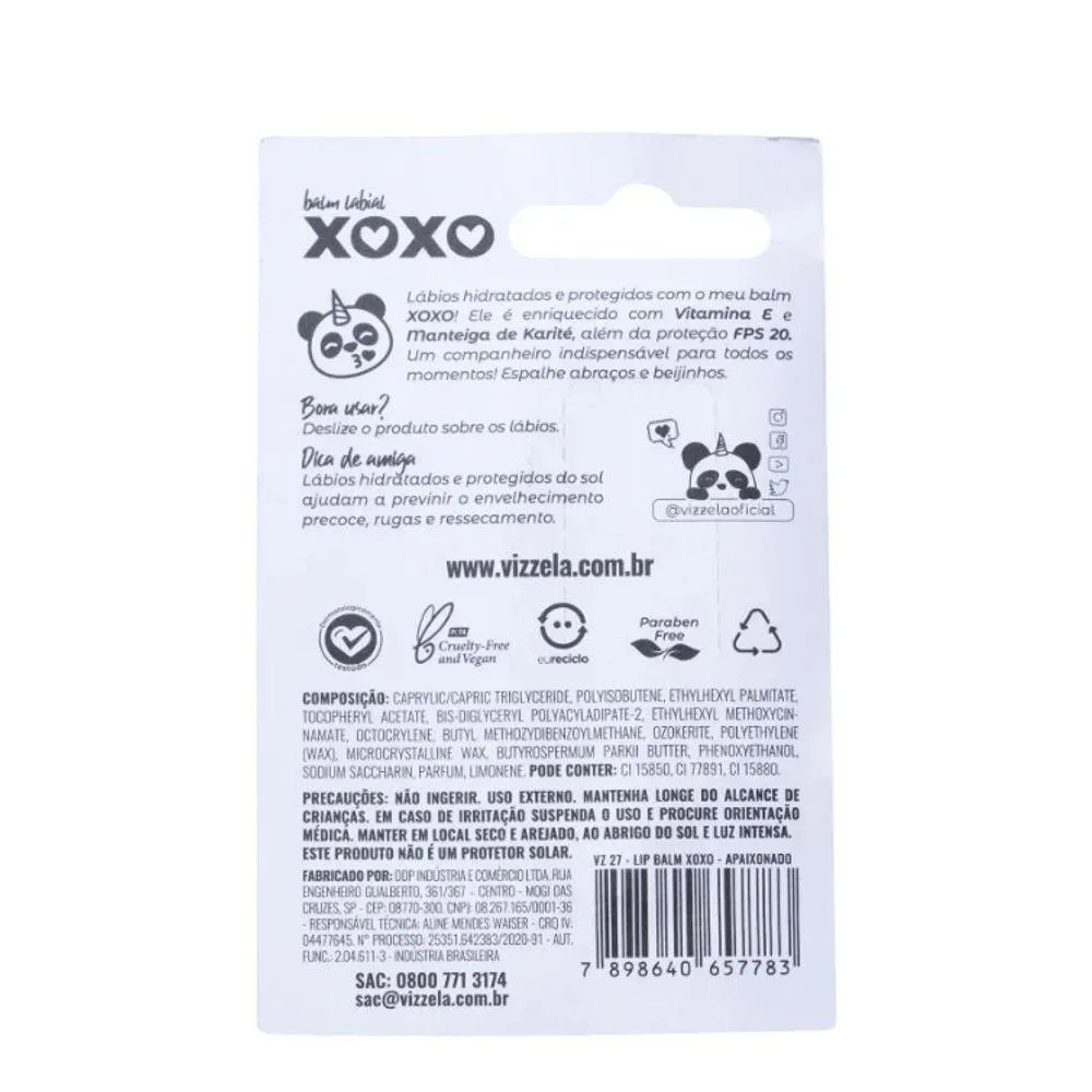 - Bálsamo labial. Vizzela Cosméticos Balm Xoxo traz fórmula com vitamina e, manteiga de karité e FPS 20 para deixar os lábios hidratados, macios e protegidos do sol e do ressecamento.- Vizzela Cosméticos Balm Xoxo FPS 20 atua como um protetor labial hidratante que garante um cuidado especial para os lábios, além de proporcionar um brilho suave e efeito natural.