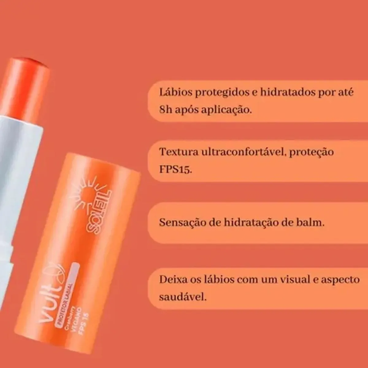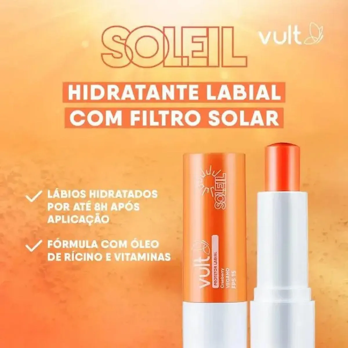 O Balm Soleil FPS15 da Vult hidrata intensamente os lábios, deixando-os macios e protegidos contra os raios solares. Com aroma suave de cranberry, fórmula vegana e textura cremosa, é ideal para o cuidado diário, prevenindo ressecamento e mantendo os lábios saudáveis. Características:- FPS15: proteção contra raios UVA e UVB