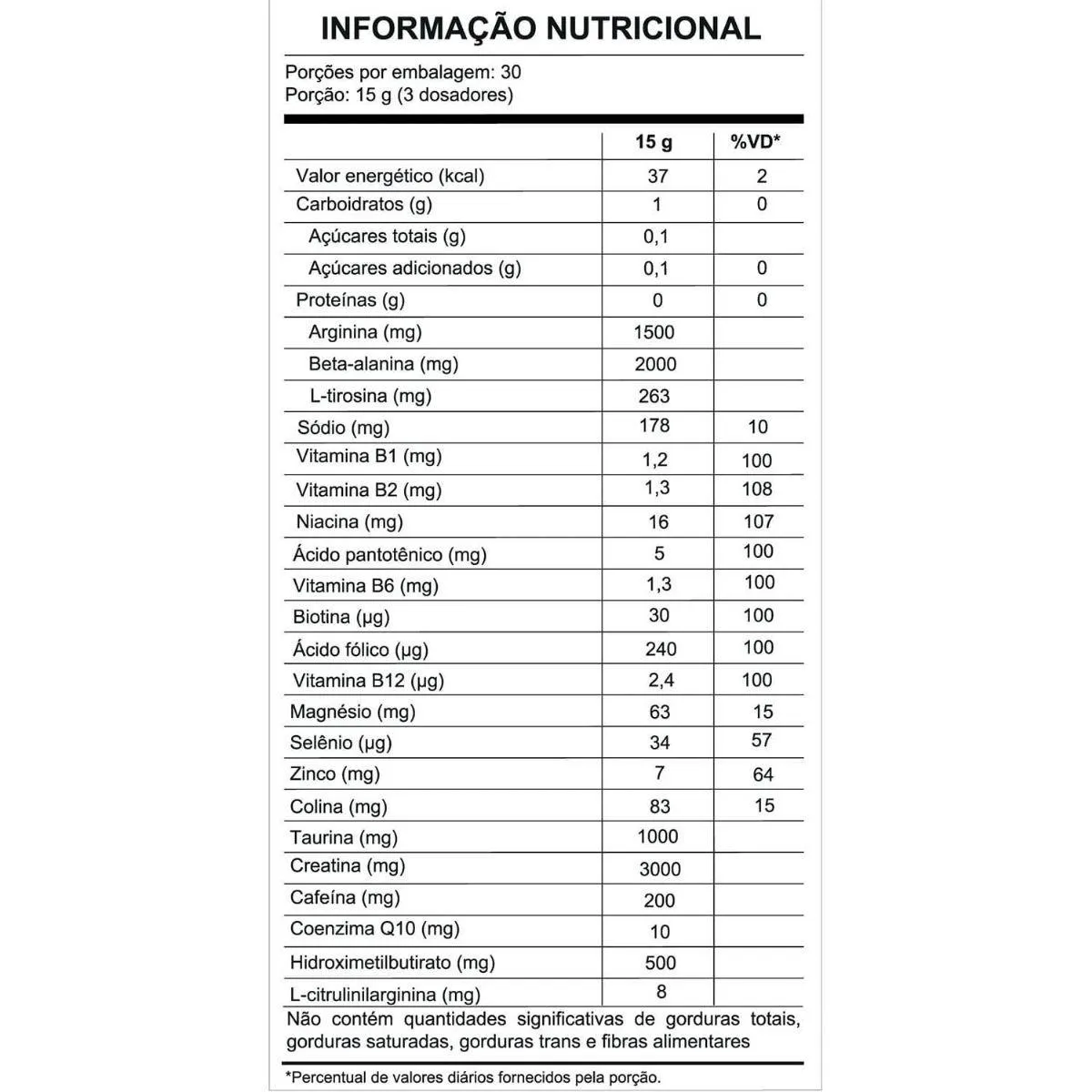 creatina, beta-alanina, cloridrato de L-arginina, taurina, maltodextrina, hidroximetilbutirato de cálcio, L-tirosina, cafeína, bitartarato de colina, óxido de magnésio, alga chondrus crispus invernal (Citarg), coenzima Q10, nicotinamida, óxido de zinco, pantotenato de cálcio, selenito de sódio, cloridrato de piridoxina, biotina, mononitrato de tiamina, riboflavina, ácido fólico, cianocobalamina, acidulante ácido cítrico, antiumectante dióxido de silício e fosfato tricálcico, aromatizantes naturais beterraba em pó e melancia em pó, aromatizante idêntico ao natural, edulcorante sucralose e acessulfame de potássio, regulador de acidez bicarbonato de sódio, corante tartrazina e azul brilhante FCF.