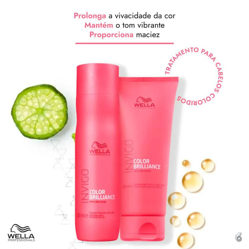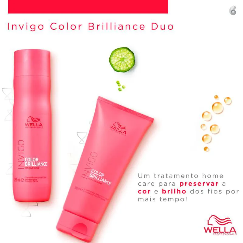 Kit de tratamento para cabelos coloridos. Kit Wella Professionals Invigo Color Brilliance Duo preserva a cor e brilho por mais tempo, além de garantir maciez.O Kit Wella Professionals Invigo Color Brilliance Duo conta com fórmulas especiais, enriquecidas com ativos antioxidantes que ajudam a manter a cor nos fios e vibrante por até 7 semanas. Também possui perfume encantador.