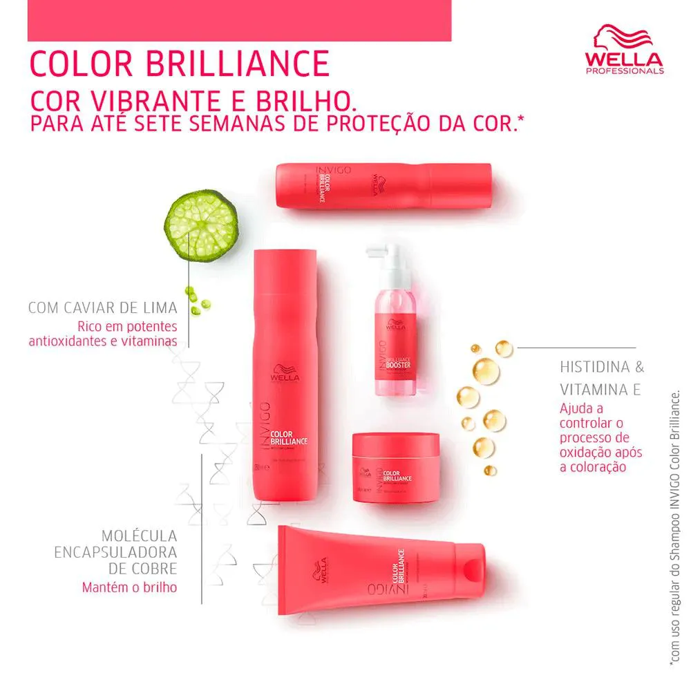 Ativos Principais: Color Brilliance-Blend? protege e realça a vibrância da cor, moléculas encapsuladas de cobre mantêm a cor por mais tempo, caviar de limão hidrata e suaviza os fios coloridos.