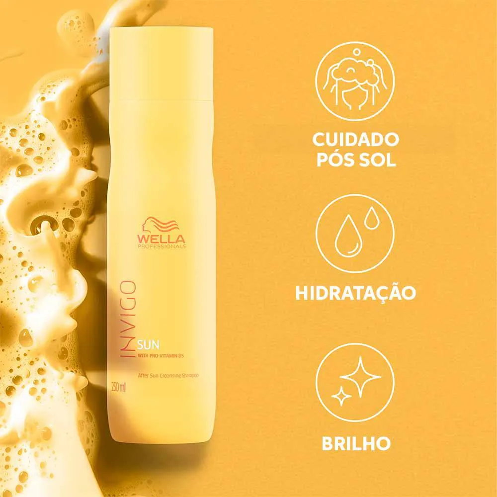 Você sabia que seus cabelos também precisam de proteção solar? Invigo Sun shampoo Pós Sol de Wella Professionals proporciona uma limpeza profunda aos fios após a exposição a água do mar, areia e aos raios UV. A linha é indicada para a reconstrução e proteção dos fios contra raios UV, além de garantir a proteção da cor. Use antes, durante e depois da exposição ao sol.