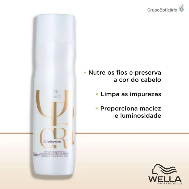 Limpeza suave com nutrição, brilho e proteção da cor.O Shampoo Wella Professionals Oil Reflections Luminous Reveal proporciona uma limpeza delicada e eficaz, deixando os fios macios, luminosos e levemente condicionados. Ideal para todos os tipos de cabelo, ele nutre e preserva a cor, mantendo-a vibrante e radiante por mais tempo. Sua fórmula avançada protege as cutículas contra radicais livres e ajuda a eliminar impurezas da superfície dos fios, protegendo também contra os efeitos nocivos dos minerais presentes na água e no ambiente.