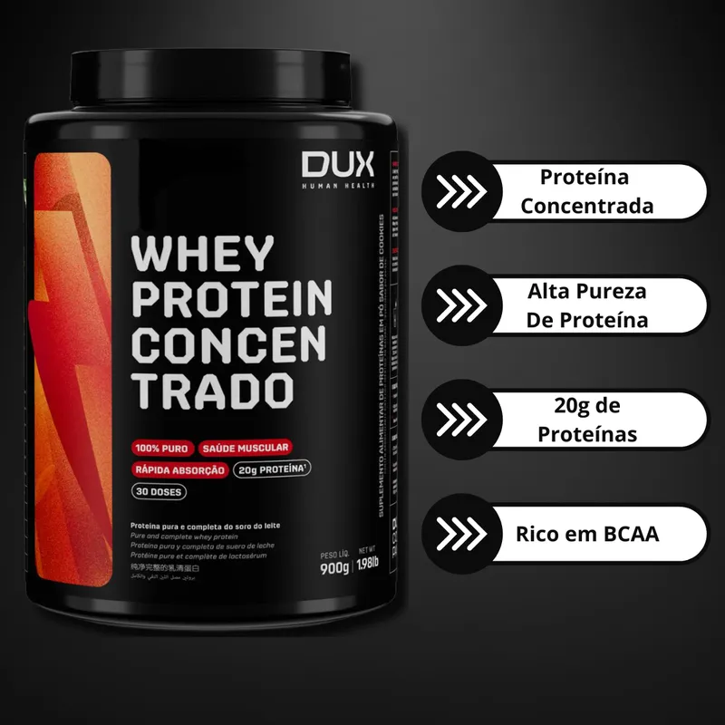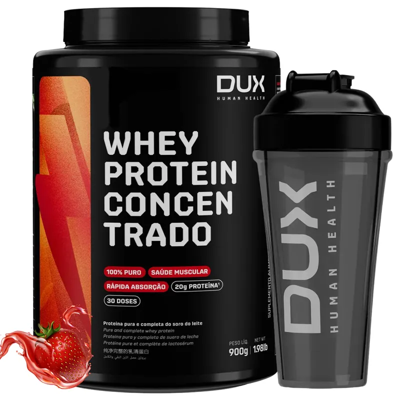 O que é e para que serve o Whey Concentrado 900G Dux Nutrition - Morango + Coqueteleira?