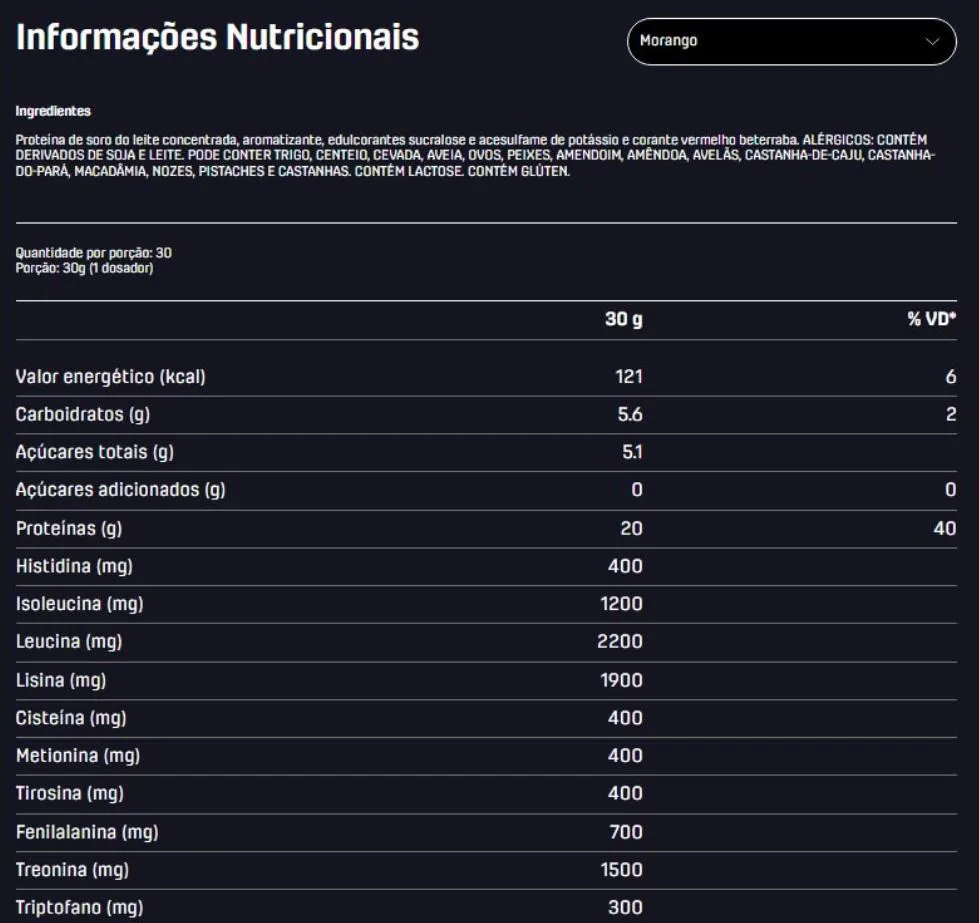 - Não recomendado para pessoas com intolerância à lactose. Consumidores com esta condição devem optar por whey protein isolado ou hidrolisado.
