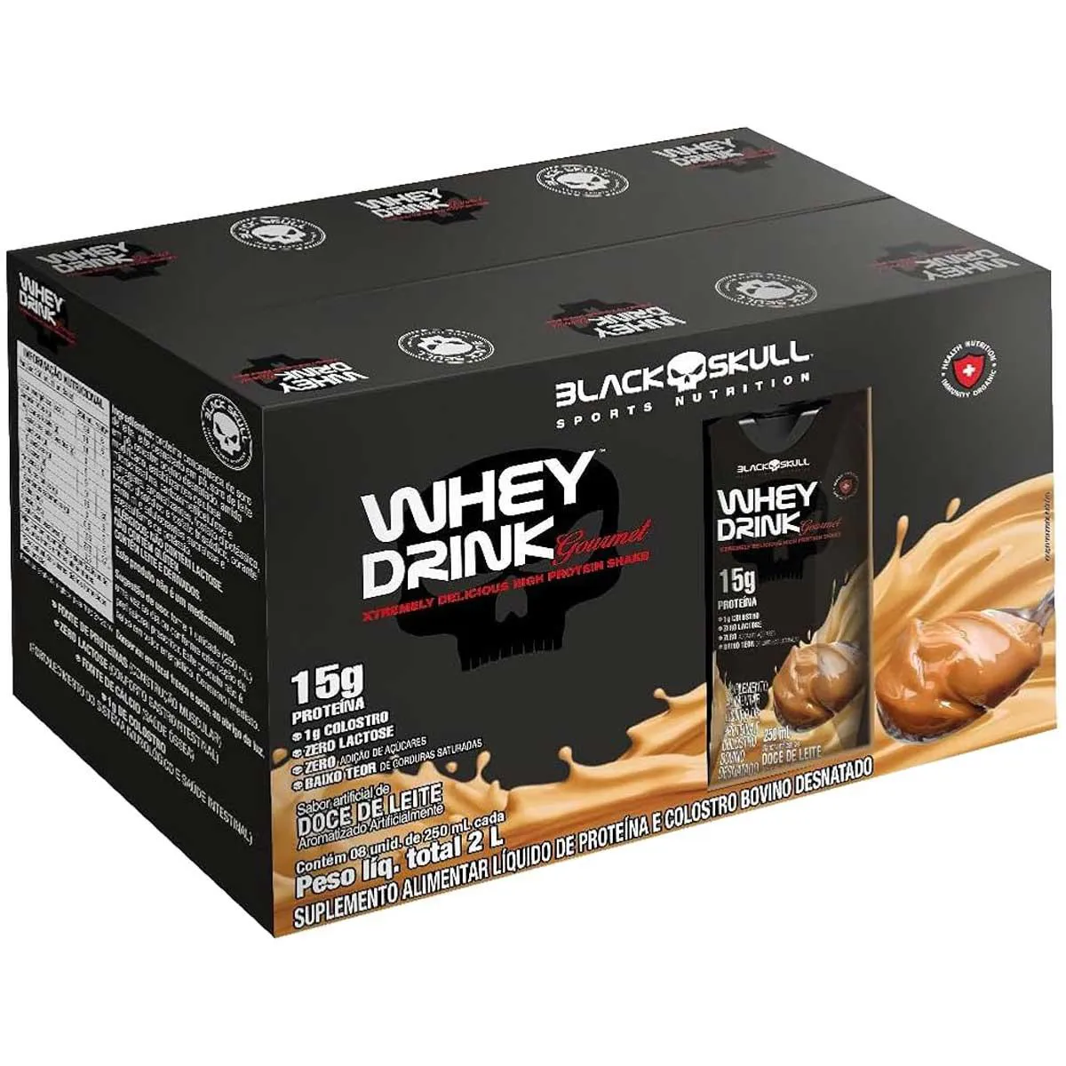 O whey pronto para beber da BLACK SKULL, o WHEY DRINK GOURMET™, possui 1g de colostro bovino e fornece 15 g de proteínas de alto valor biológico a cada unidade (250 ml). Além disso, ele é livre de lactose, então pode ser consumido por indivíduos com algum tipo de intolerância a laticínios. Também não para por aí: o WHEY DRINK GOURMET™ é o primeiro whey pronto para beber do mercado com o colostro bovino na formulação. O colostro é uma combinação poderosa de bioativos (moduladores imunológicos, oligossacarídeos e imunoglobulinas) que apoiam os sistemas imunológico, respiratório e digestório. Para praticantes de atividade física, o consumo regular do whey protein pronto para beber pode beneficiar o rendimento esportivo e a hipertrofia também. Com apenas uma caixinha, você consome 15 g de proteína de alto valor biológico. O whey pronto não tem adição de açúcares e possui um baixo teor de gorduras. Por isso, ele é um excelente produto para ingerir nas refeições intermediárias ou quando sentir a necessidade de comer um doce.