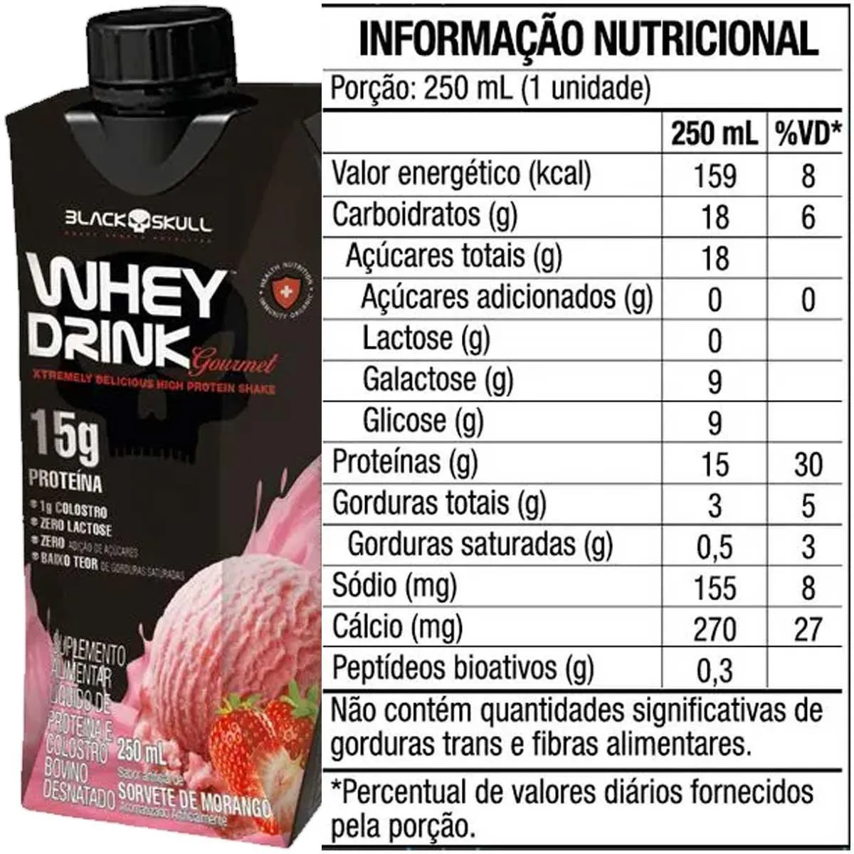 O whey pronto para beber da BLACK SKULL, o WHEY DRINK GOURMET™, possui 1g de colostro bovino e fornece 15 g de proteínas de alto valor biológico a cada unidade (250 ml). Além disso, ele é livre de lactose, então pode ser consumido por indivíduos com algum tipo de intolerância a laticínios. Também não para por aí: o WHEY DRINK GOURMET™ é o primeiro whey pronto para beber do mercado com o colostro bovino na formulação. O colostro é uma combinação poderosa de bioativos (moduladores imunológicos, oligossacarídeos e imunoglobulinas) que apoiam os sistemas imunológico, respiratório e digestório. Para praticantes de atividade física, o consumo regular do whey protein pronto para beber pode beneficiar o rendimento esportivo e a hipertrofia também. Com apenas uma caixinha, você consome 15 g de proteína de alto valor biológico. O whey pronto não tem adição de açúcares e possui um baixo teor de gorduras. Por isso, ele é um excelente produto para ingerir nas refeições intermediárias ou quando sentir a necessidade de comer um doce.