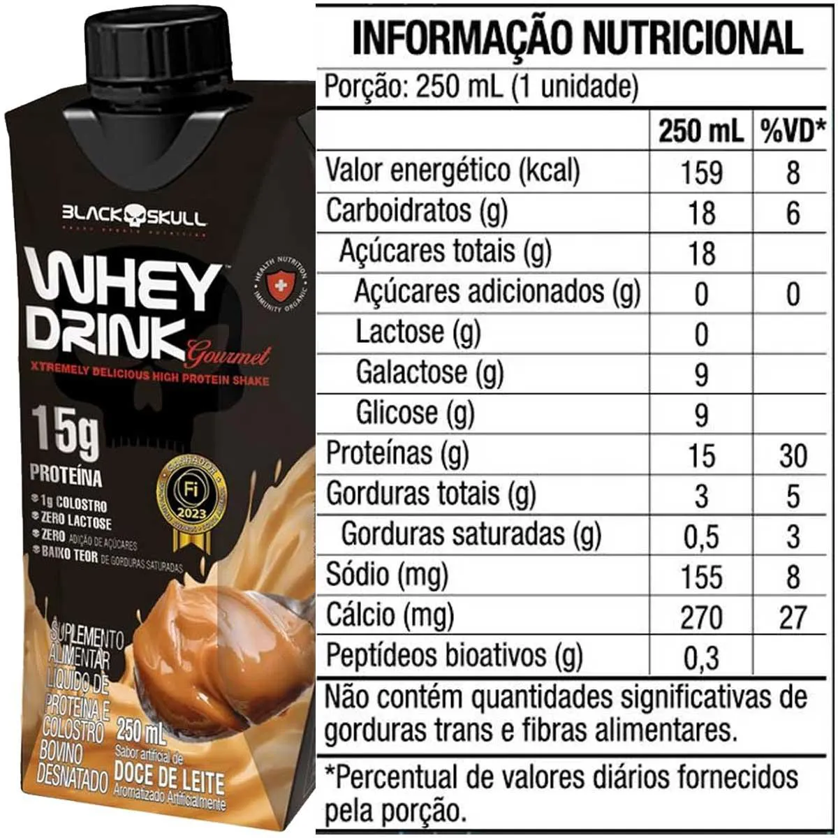 O Whey Drink Gourmet é uma bebida proteica pronta para consumo, desenvolvida pela BLACK SKULL, que contém 15g de proteínas de alto valor biológico por unidade. É um suplemento alimentar livre de lactose, inovador no mercado por conter colostro bovino em sua formulação. Serve para auxiliar praticantes de atividade física na recuperação muscular, ganho de massa muscular, controle de saciedade e suporte ao sistema imunológico, respiratório e digestório. Pode ser consumido a qualquer hora do dia como complemento nutricional, sendo uma opção prática para ingestão de proteínas sem adição de açúcares.