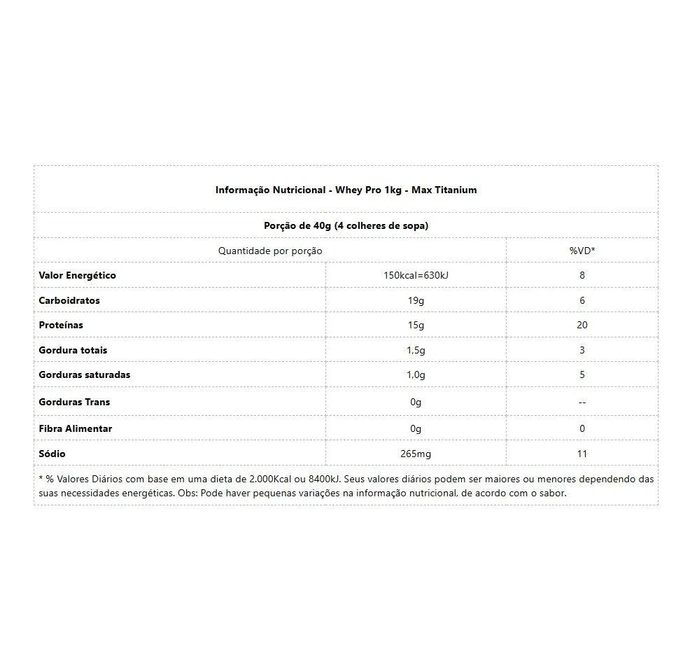 Whey Pro Pote (1kg) Whey Pro Max Titanium 1 kg é um suplemento proteico do soro de leite concentrado, de alto valor biológico e de excelente absorção. A proteína é uma substância encontrada em todas as células e tecidos do corpo, formando os principais elementos naturais. Por isso, o whey protein auxilia na construção de músculos e na reparação pós exercício físico, necessários para o crescimento da massa muscular. Com baixo teor de gordura e carboidratos, o suplemento proteico é rico em aminoácidos essenciais, contando com 3,4 g de bcaa, que auxiliam no anabolismo. O whey protein combinado à prática regular de atividades físicas na academia e a uma dieta balanceada, auxilia na definição muscular. Benefícios: - Alta quantidade de BCAA's;- Alto valor biológico;- Coadjuvante na formação de massa muscular;- Recuperação muscular pós-treino.