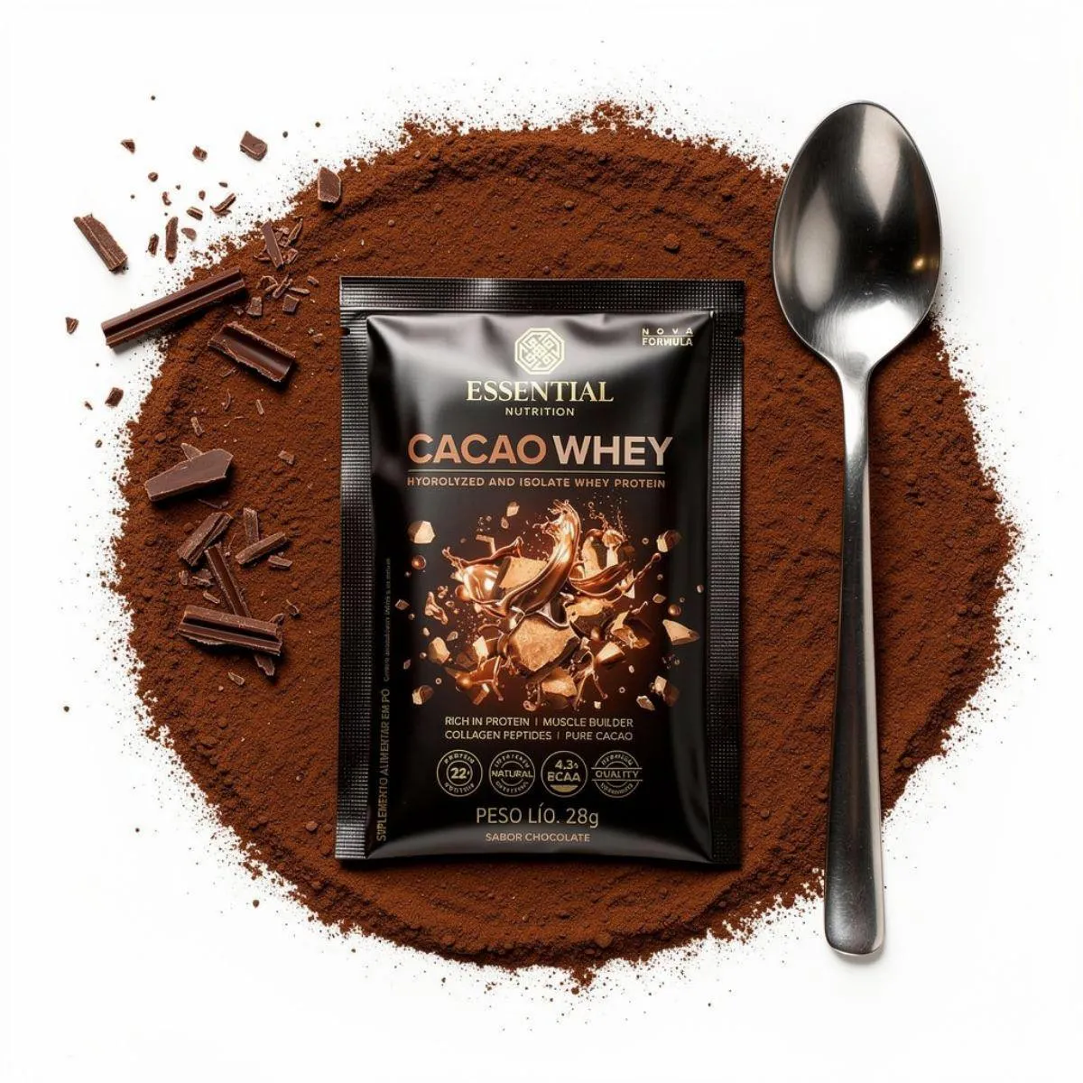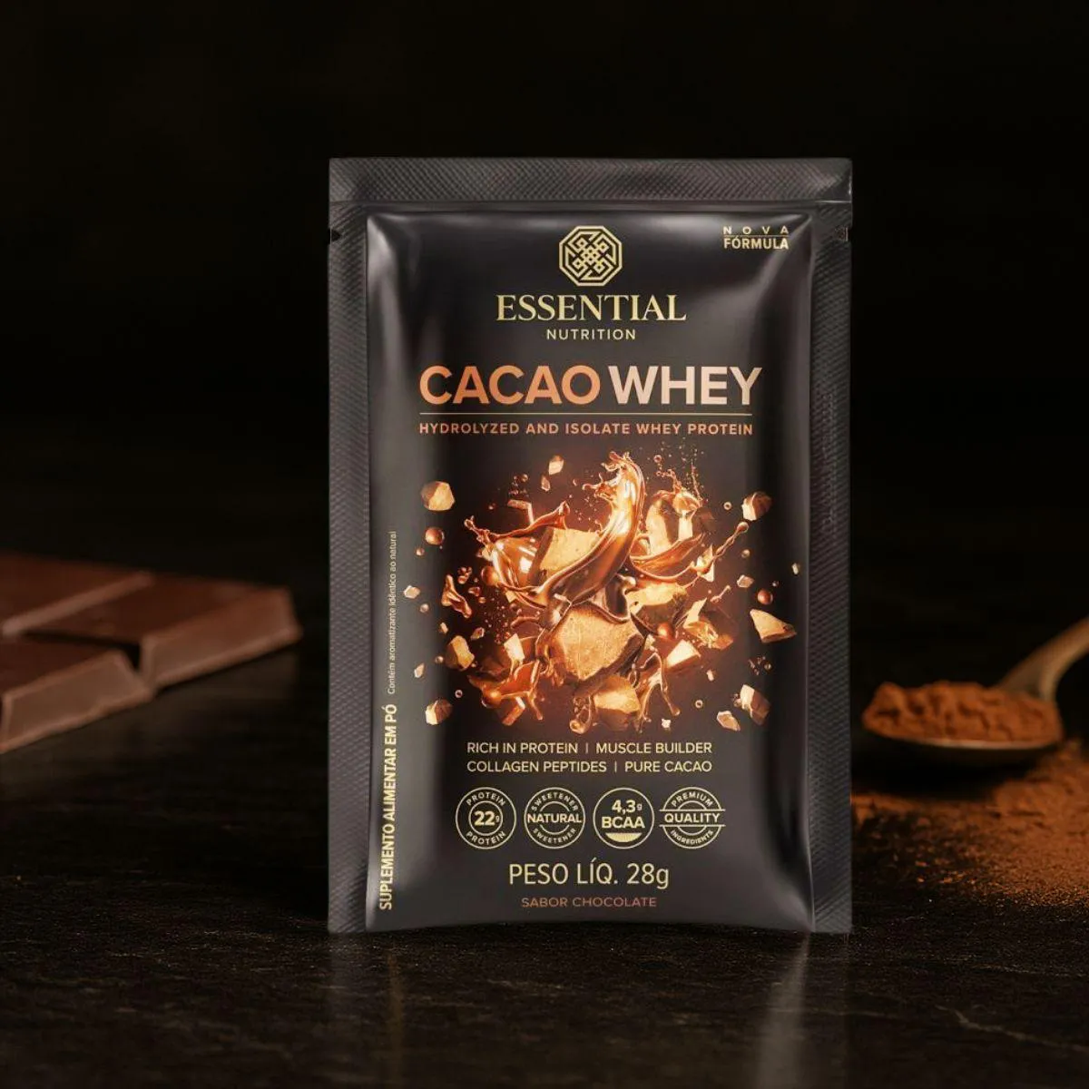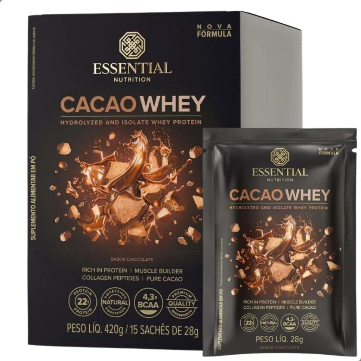 whey protein Cacao 30 g da Essential Nutrition vem em 15 sachês prontos para consumo, totalizando 450 g. Cada porção combina whey protein isolado e hidrolisado com cacau puro, fornecendo 22 g de proteína de alta qualidade.