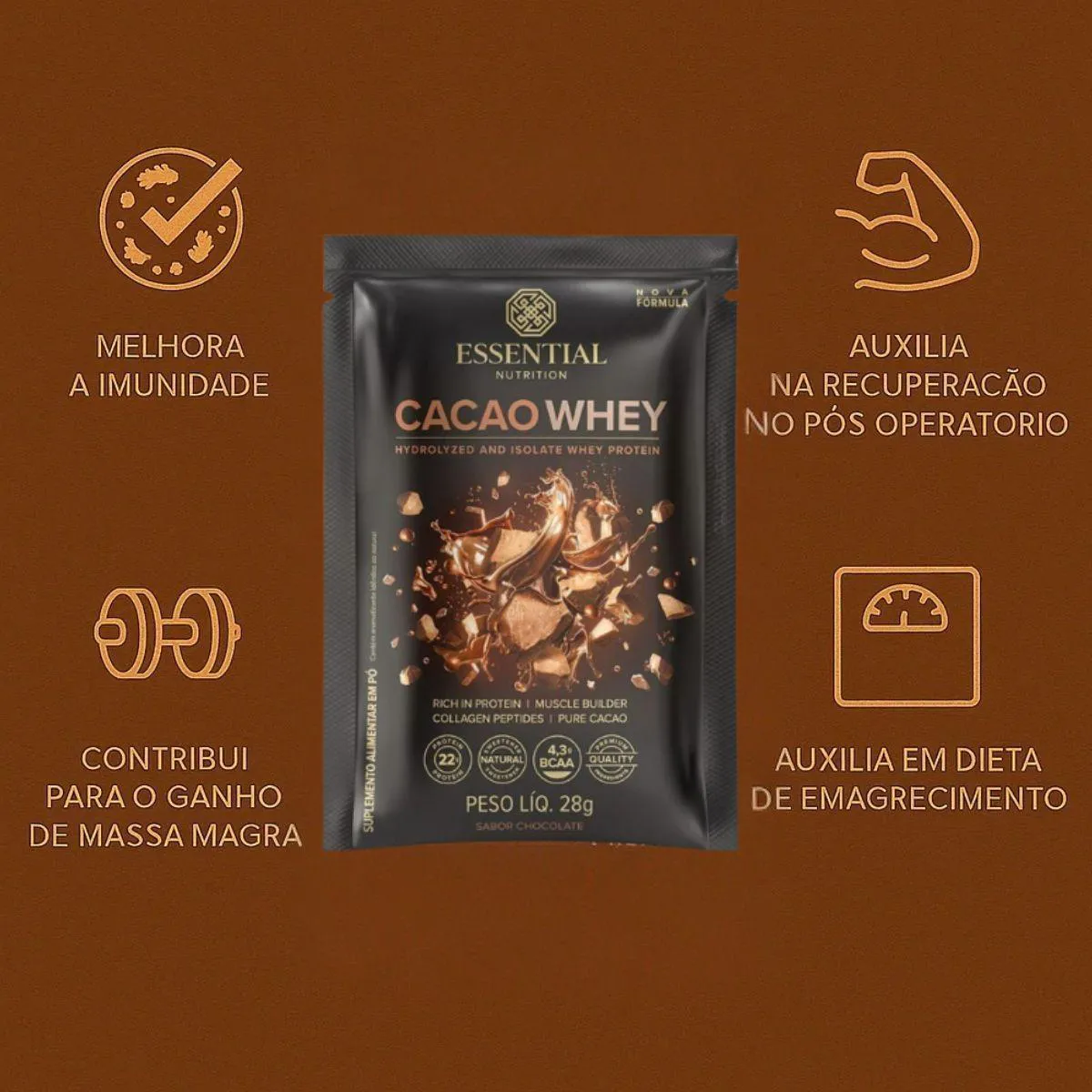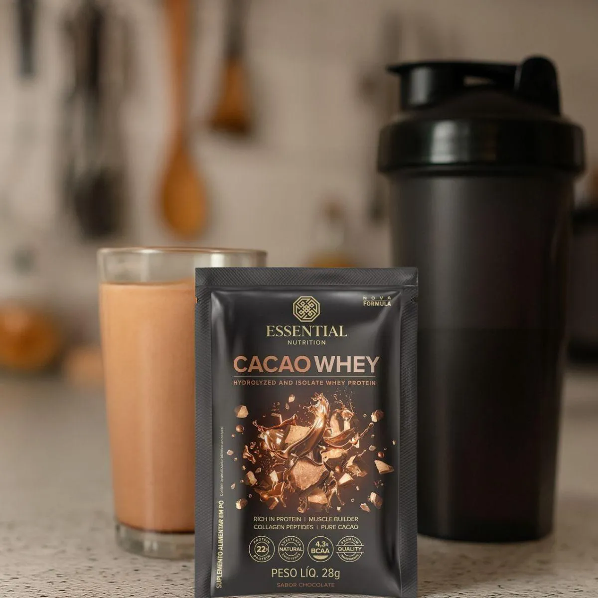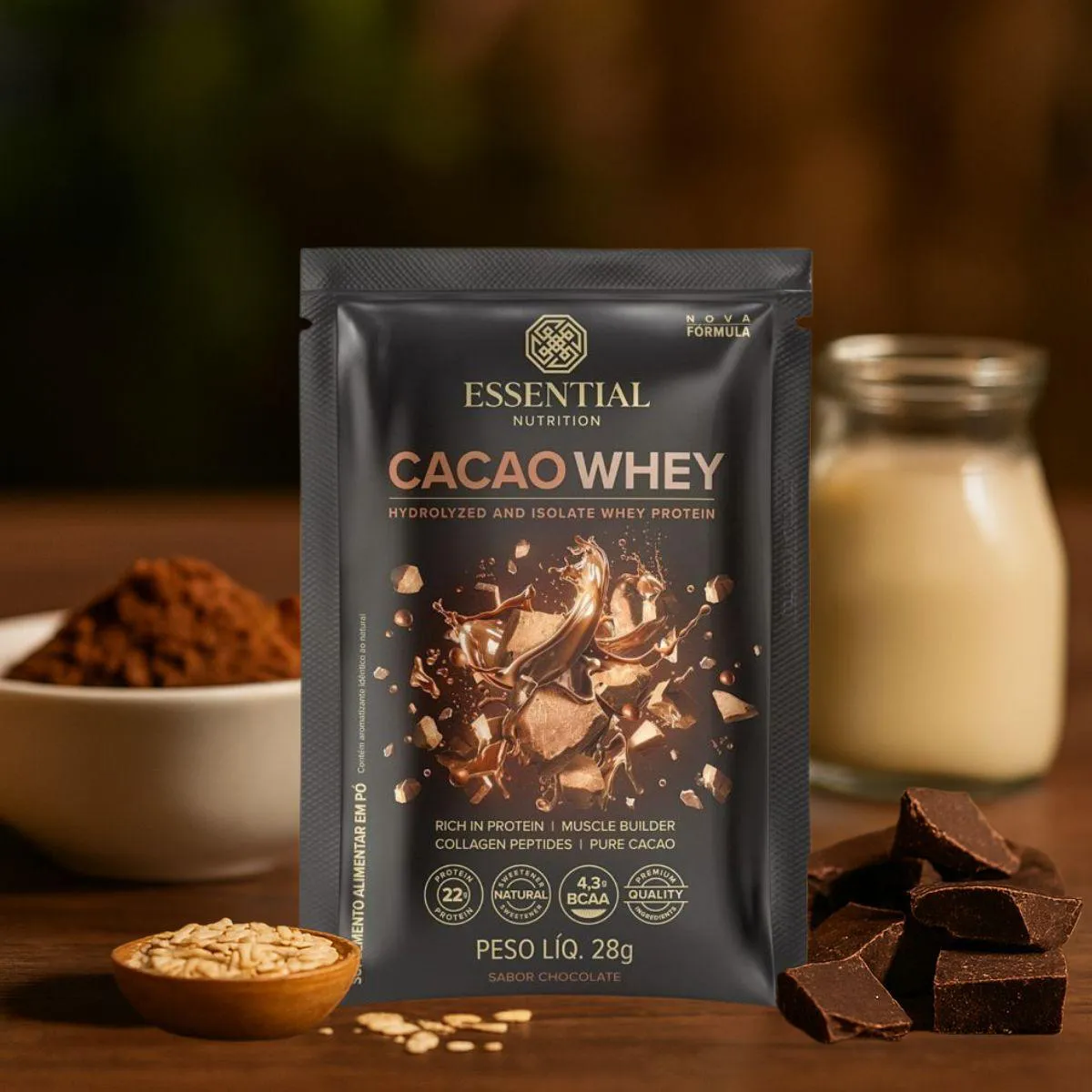 whey protein Cacao 30 g da Essential Nutrition vem em 15 sachês prontos para consumo, totalizando 450 g. Cada porção combina whey protein isolado e hidrolisado com cacau puro, fornecendo 22 g de proteína de alta qualidade.