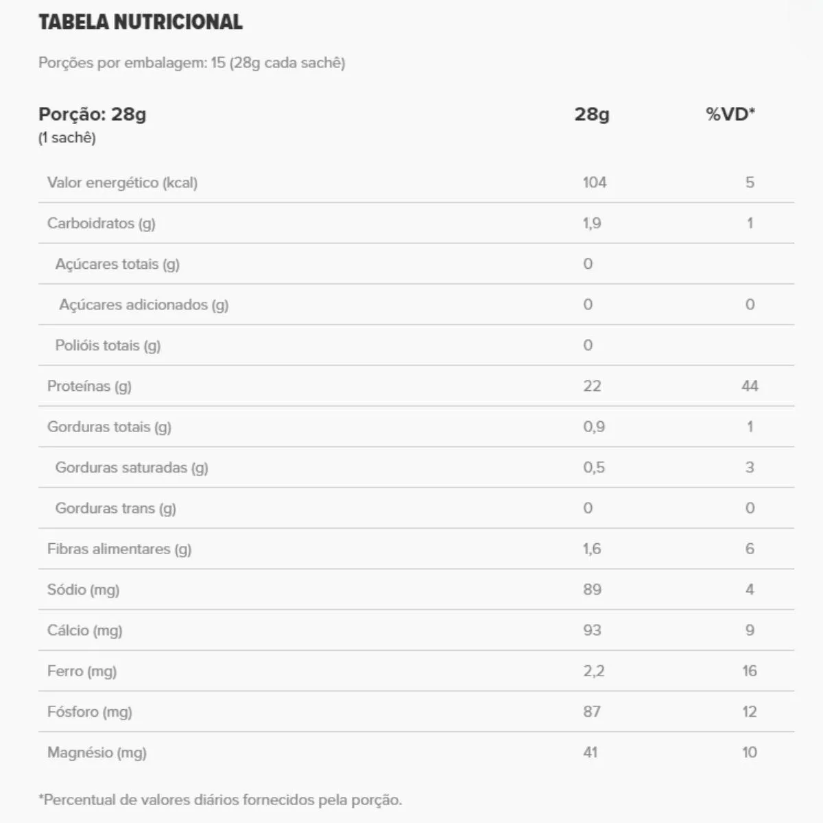A formulação utiliza proteínas filtradas por microfiltração cruzada, cacau 100% e adoçantes naturais como estévia, sem açúcar, glúten, lactose ou corantes artificiais.