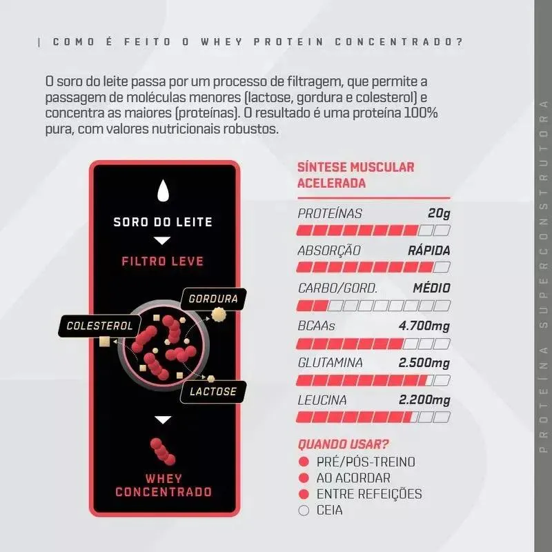 O Whey Protein Concentrado é uma proteína pura e completa do soro do leite, obtida através de um rigoroso processo de filtragem. É um suplemento nutricional que fornece 20g de proteína por porção, com um perfil completo de aminoácidos essenciais. Produzido para ser uma fonte altamente absorvível de nutrientes proteicos.