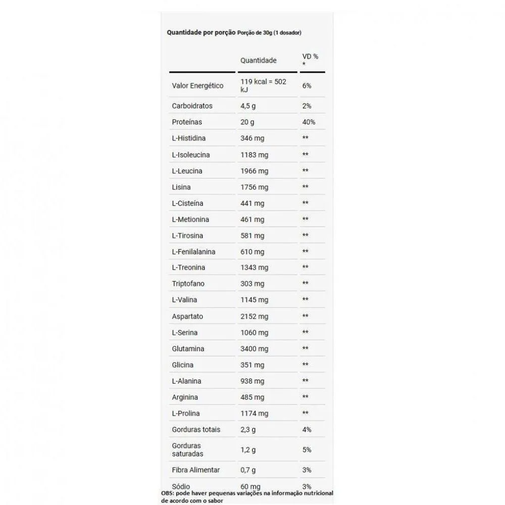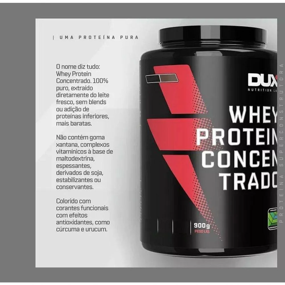 snacks fit e receitas sem culpa) e pessoas que buscam uma proteína ultrapura de altíssima qualidade.Informação NutricionalWhey Protein Concentrado (900g) - Dux Nutrition - ChocolatePorção de 28g (1 medidor)Valor Energético: 119kcal = 502kJ (6% VD)Carboidratos: 4,5g (1% VD)Proteínas: 20g (40% VD)Gorduras Totais: 2,3g (4% VD)Gorduras Saturadas: 1,2g (5% VD)Fibra Alimentar: 0,7g (3% VD)Sódio: 60mg (3% VD)
