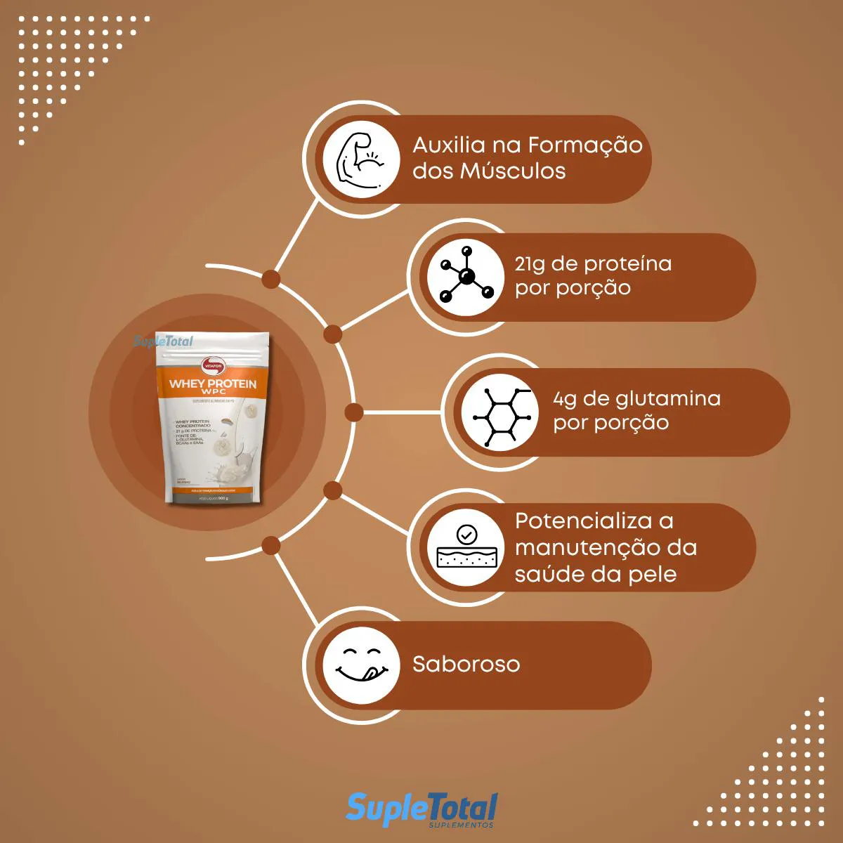 - Dados científicos De acordo com estudos, o soro do leite, como o presente na forma concentrada do whey protein, é um grande aliado para quem busca a formação de músculos. Isso porque tem maior biodisponibilidade, solubilidade e concentração de aminoácidos de cadeia ramificada, que são essenciais para o organismo¹. Além disso, o whey protein pode ser um excelente aliado no controle de saciedade², sem falar na facilidade do consumo, sendo facilmente encaixado na rotina. Se está buscando um whey protein com um ótimo custo-benefício, qualidade nutricional e indulgência de sabor, a versão concentrada da Vitafor®, Whey Protein WPC, pode ser uma boa escolha para você. Com 21g de proteína por porção e dois deliciosos sabores, morango e baunilha, auxilia na formação de músculos e ossos. Além disso, seu consumo pode ser uma opção interessante para quem busca um perfil nutricional equilibrado, pois conta com Glutamina em sua formulação³, um aminoácido amplamente reconhecido por sua participação em diversas funções metabólicas do organismo